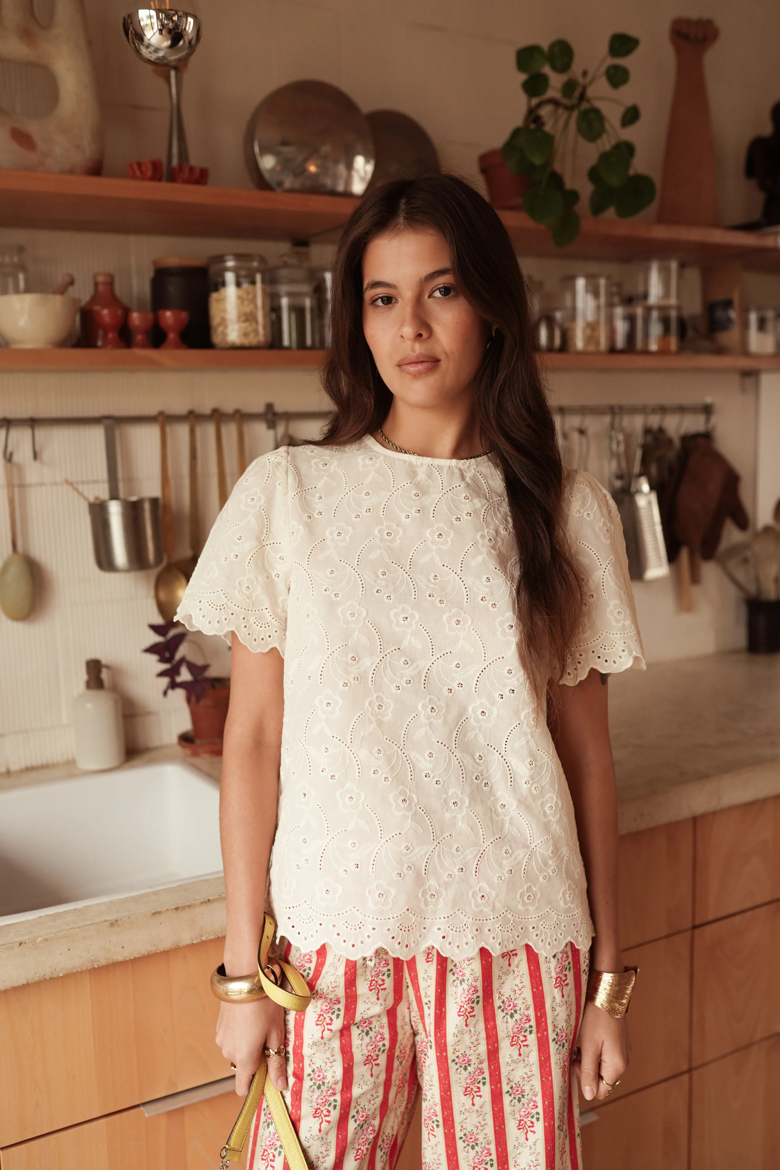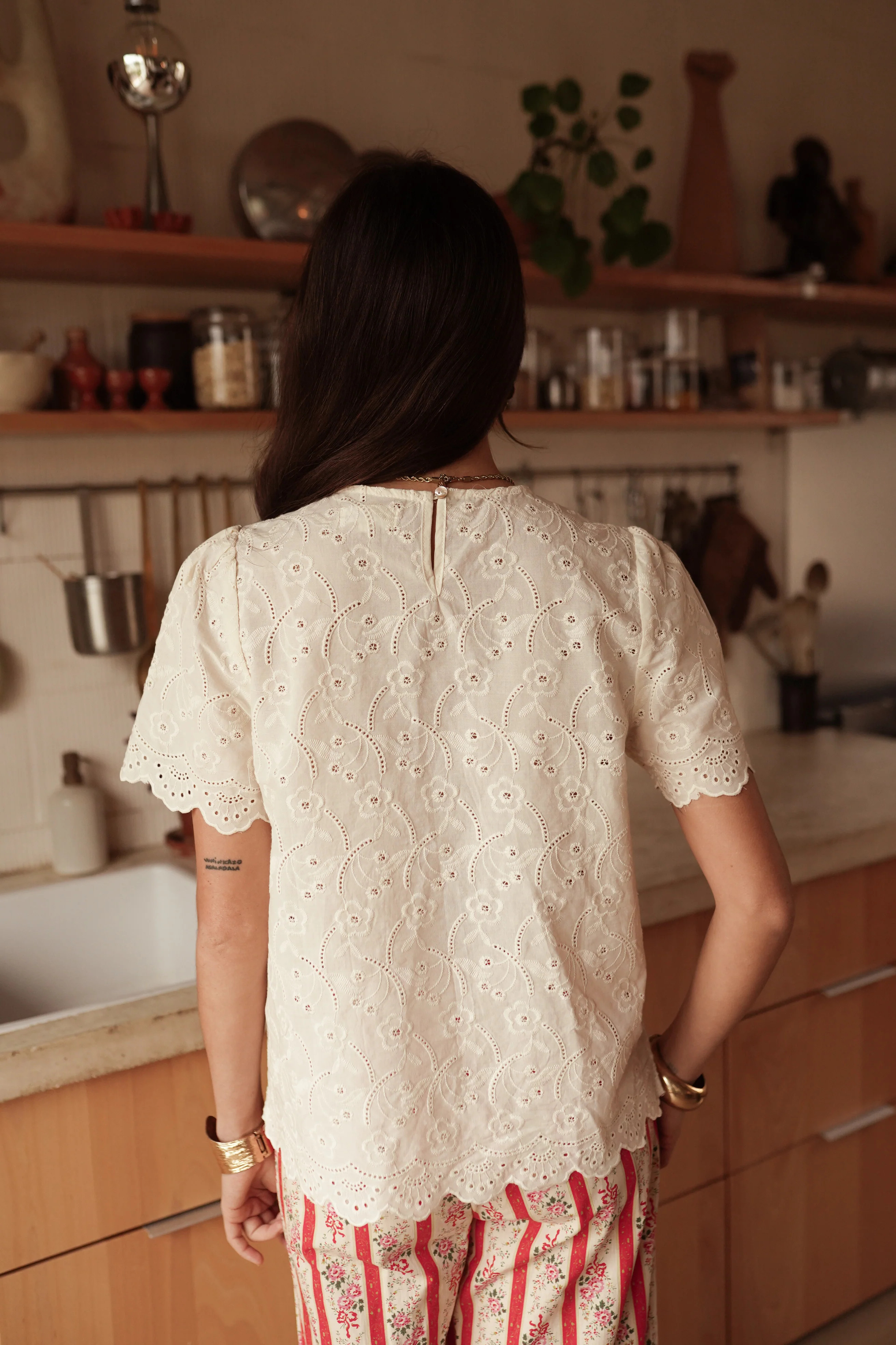 La blouse ELVIRA est composée d'un joli tissu léger en broderie anglaise à motif floral sur fond écru avec des manches courtes au joli détail festonné. Une pièce douce et féminine, facile à porter au quotidien.