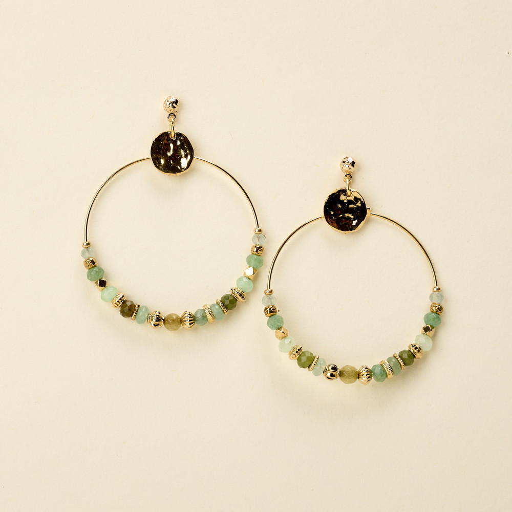 Les boucles d'oreilles By Garance BOYE VERT sont composées d'une créole dorée avec un enfilage de perles en pierres naturelles aux nuances de vert et perles dorées aux formes variées.