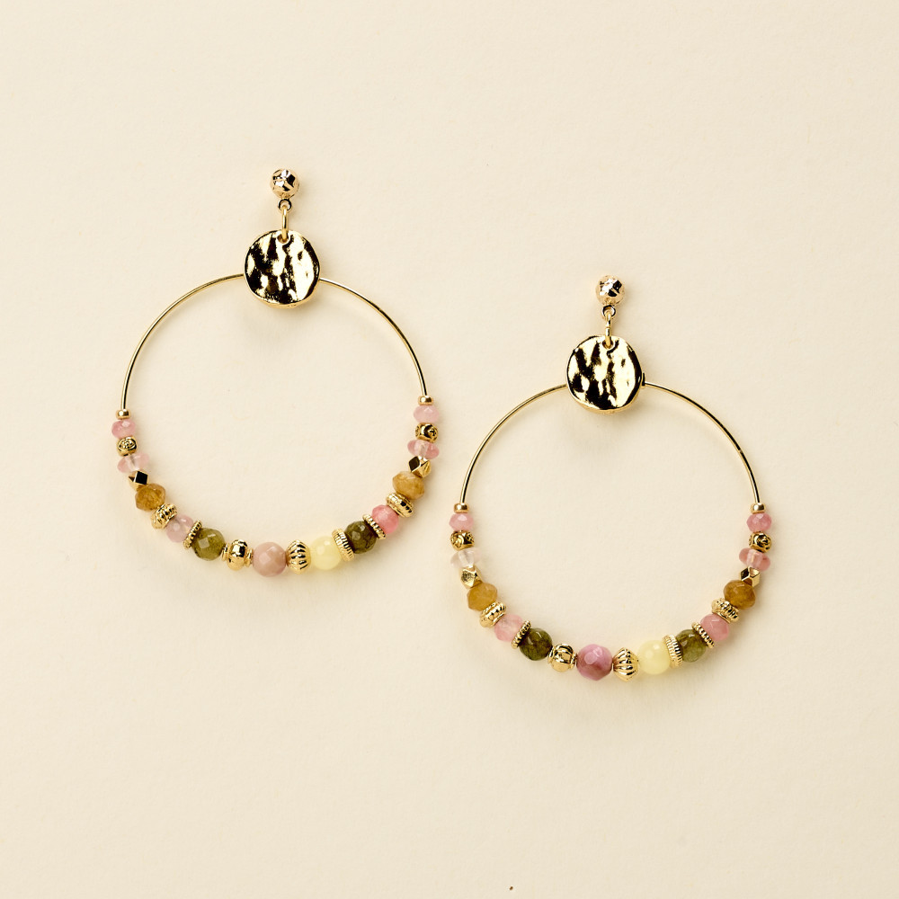 Les boucles d'oreille By Garance BOYE JAUNE MULTI sont composées d'une créole dorée avec un enfilage de perles en pierres naturelles aux nuances de jaune rose marron et perles dorées aux formes variées.