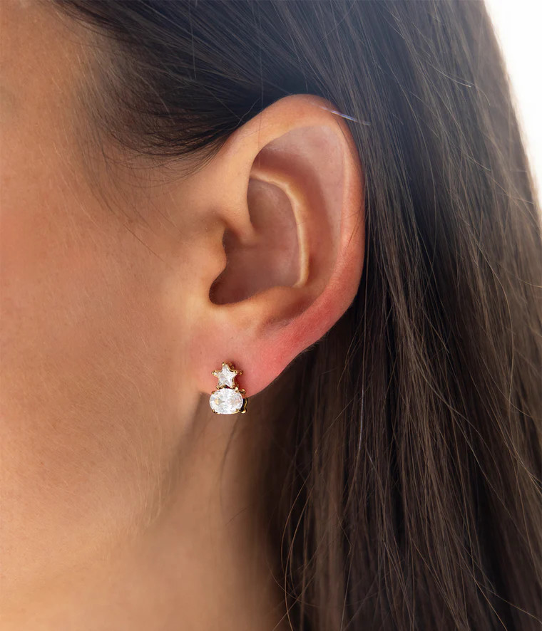 Boucles d'oreilles ZAG modèle GIOIA en acier inoxydable doré avec un élément ovale et en forme d'étoile en zirconium monté sur tige.
