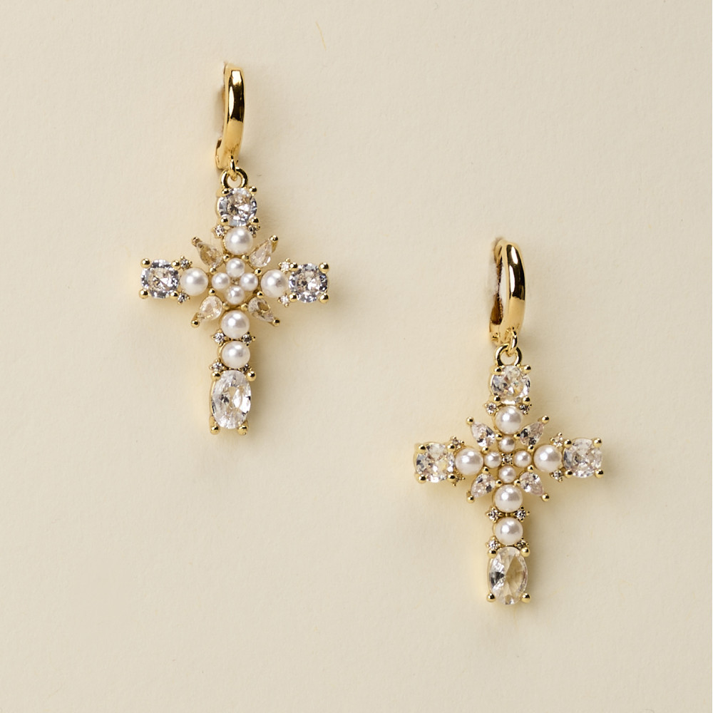 Les boucles d'oreilles LORI CROIX PERLÉE sont constituées d'un fermoir dormeur avec une jolie croix rehaussée de strass et de perles effet perles de culture.