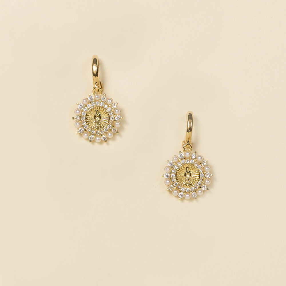 Les boucles d'oreilles IZAK VIERGE sont constituées d'un fermoir dormeur avec un joli médaillon rond rehaussée de strass et de perles effet perles de culture et d'une vierge strass au centre.