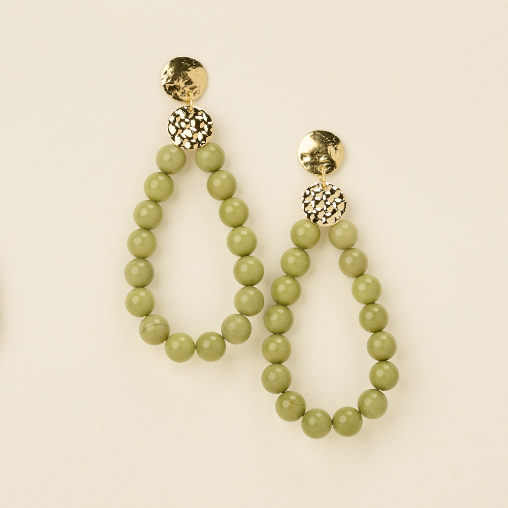 Les boucles d'oreilles AXEL sont composées d'un enfilage de perles naturelles sur une créoles en forme de goutte de 5cm de hauteur fixée sur une pièce dorée martelée sur tige pour oreilles percées.