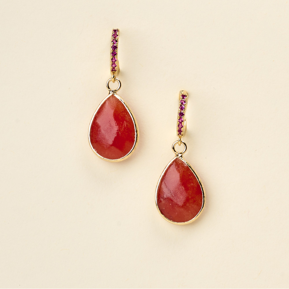 Les boucles d'oreilles BENI dévoilent une pierre en forme de goutte sertie d'un anneau doré, rehaussées d'oxydes de zirconium qui apportent de la luminosité et un coté précieux à l'ensemble.