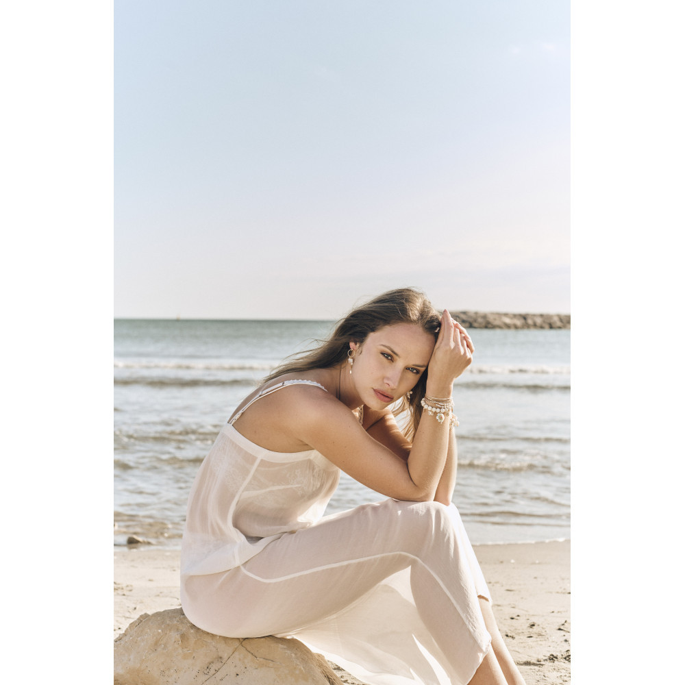 Le bracelet By Garance Dona Mina Blanc est un bracelet multi tours composé d'un enfilage de perles rondes en nacre et dorées sur un cordon blanc cassé et une chaine.