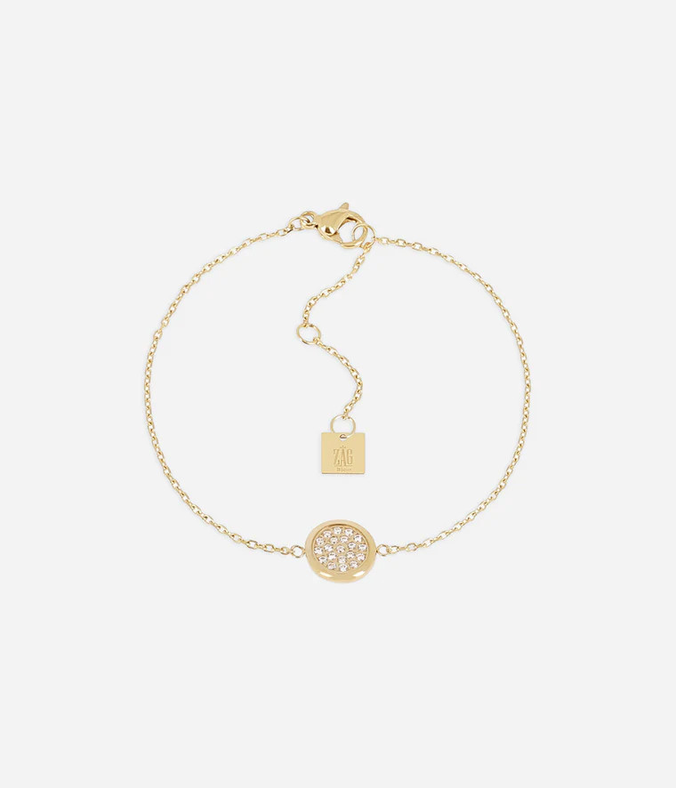 Bracelet ZAG modèle IZOU en acier inoxydable doré avec un pendentif rond serti de zircons.