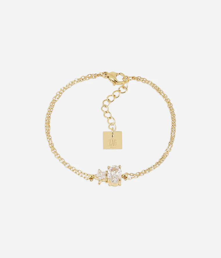 Bracelet ZAG modèle GIOIA en acier inoxydable doré avec un élément ovale et en forme d'étoile en zirconium monté sur une double chaine.