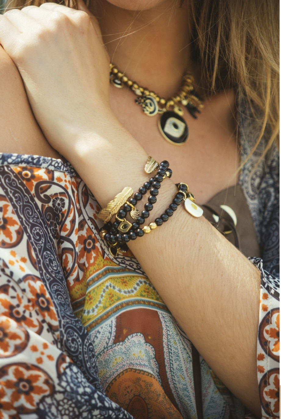 Le bracelet TRIPLE NOMADE de chez Madamirma est composé d'un enfilage de perles en oxyx naturel mat de 6mm sur un fil élastique avec des breloques aux motifs tendances du western émaillés noir et des zirconiums noirs.