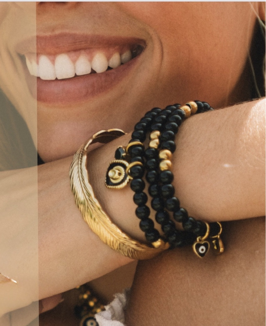 Le bracelet NOMADE WESTERN de chez Madamirma est composé d'un enfilage de perles en oxyx naturel mat de 6mm sur un fil élastique avec des breloques aux motifs du far west, tel qu'un chapeau émaillé noir et une perle ronde en zirconium noir.