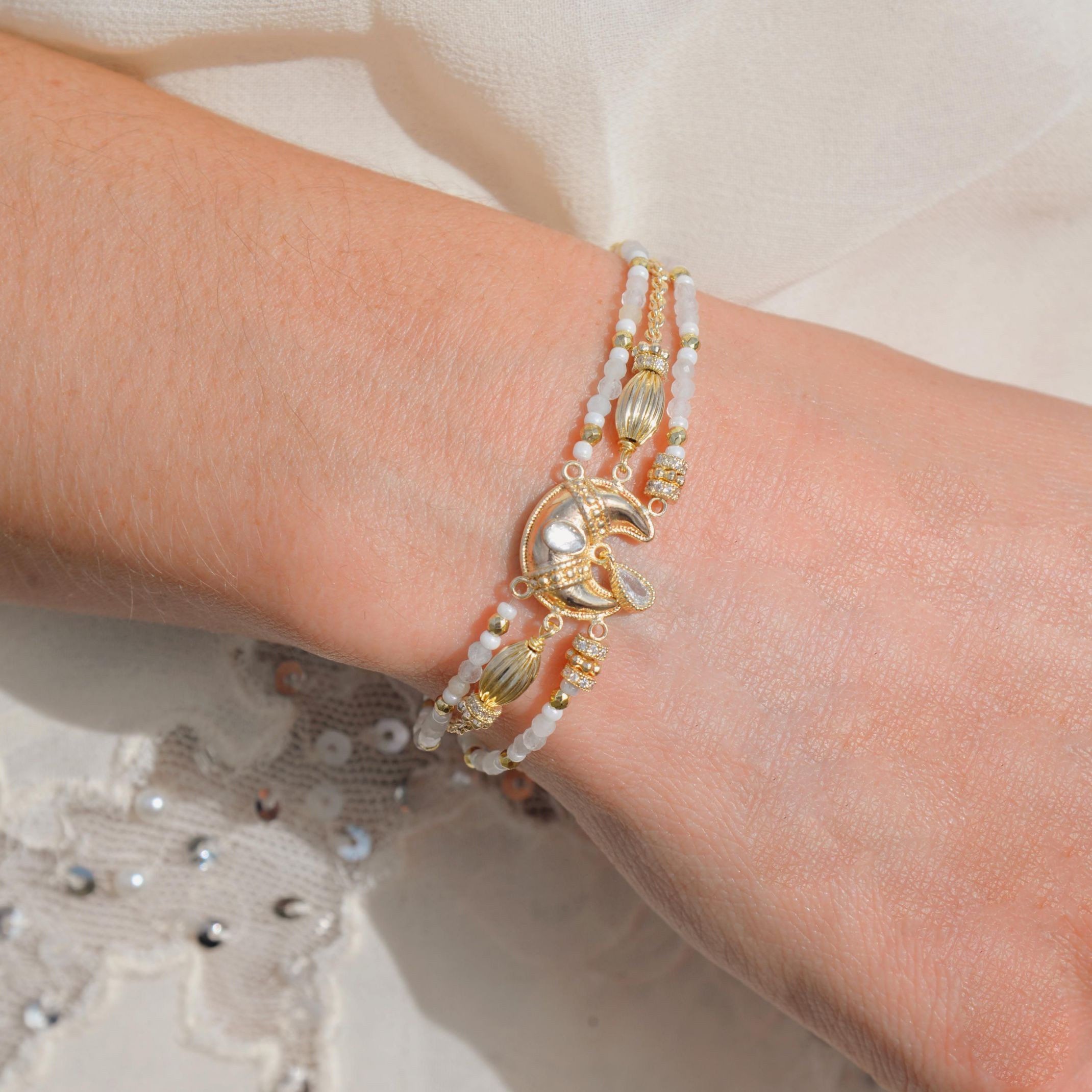 Entièrement réalisé à la main, le bracelet MANALOU est composé de trois liens attachés à un joli élément central doré en forme de croissant finement ouvragé et orné de strass pour apporter une touche subtilement orientale.