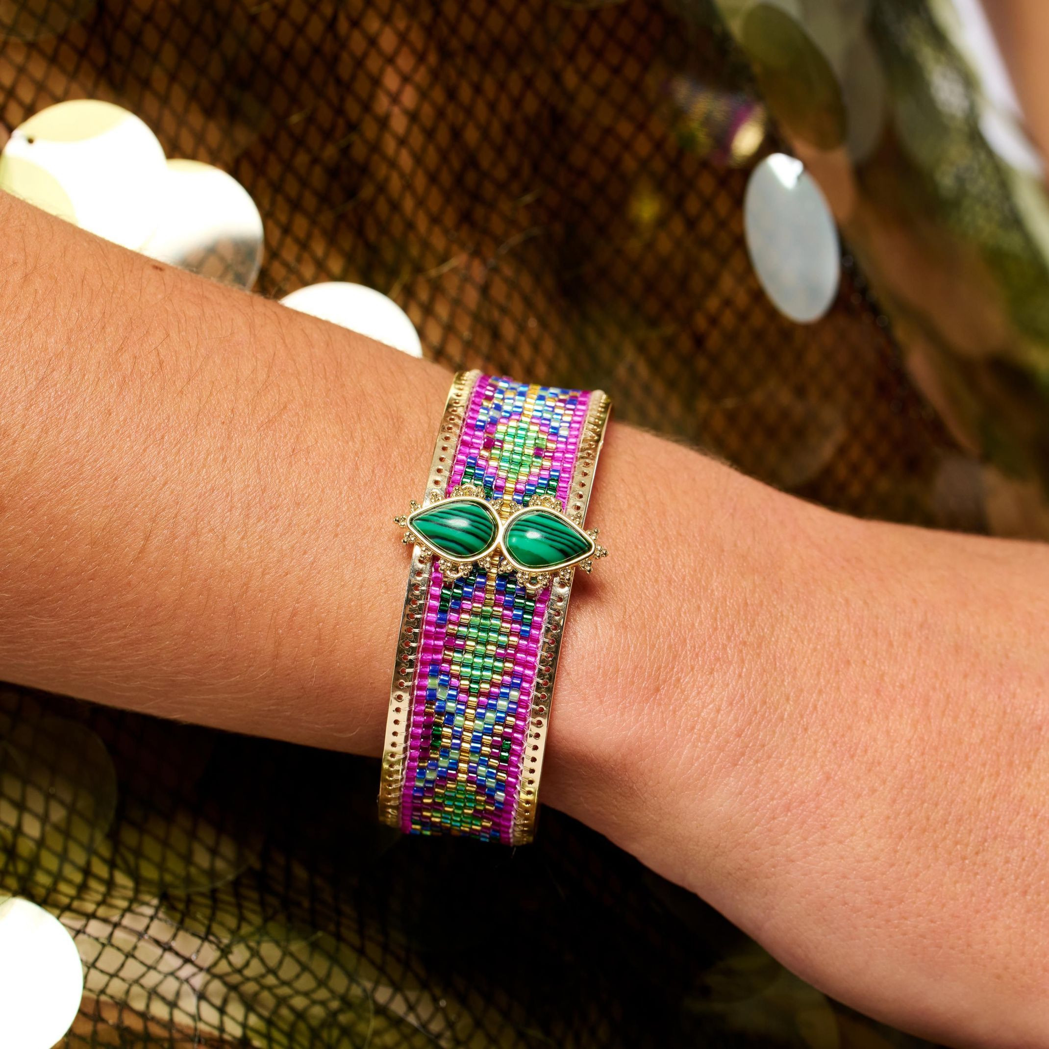 Entièrement réalisé à la main, le bracelet jonc FRISCO est magnifiquement tissé à la main avec des perles de rocaille qui représentent un motif graphique aux accents amérindiens. Le cabochon central, orné de deux gouttes en pierre imitation turquoise, malachite, onyx ou lapis lazuli selon la couleur, offre une palette de couleurs qui saura vous séduire.