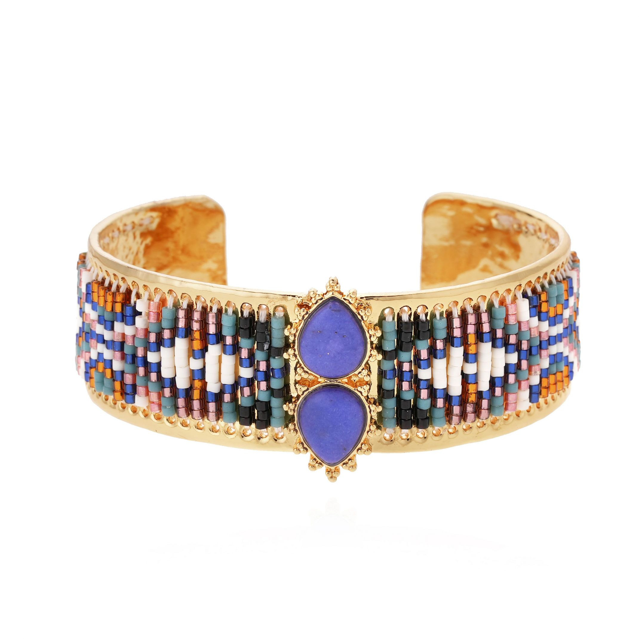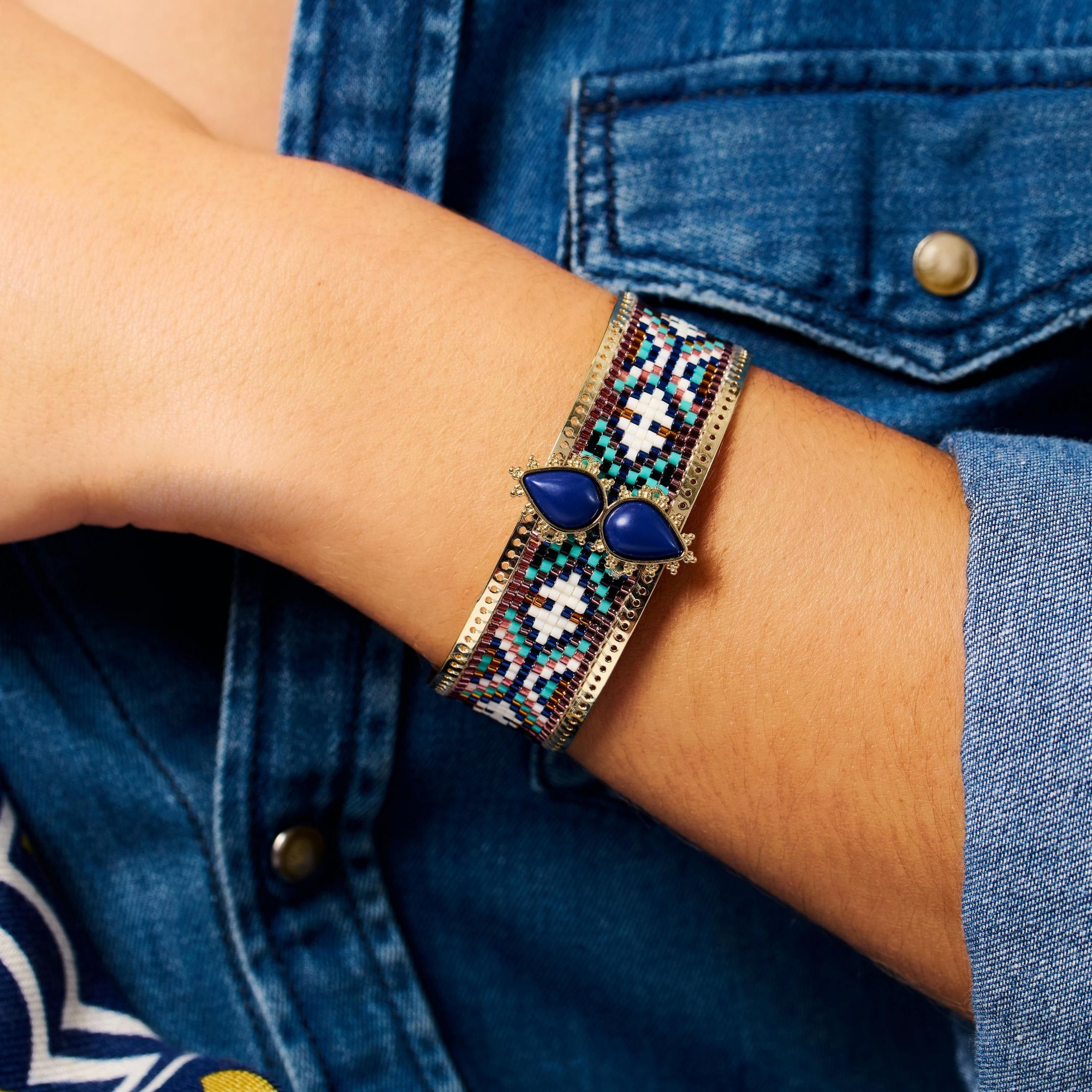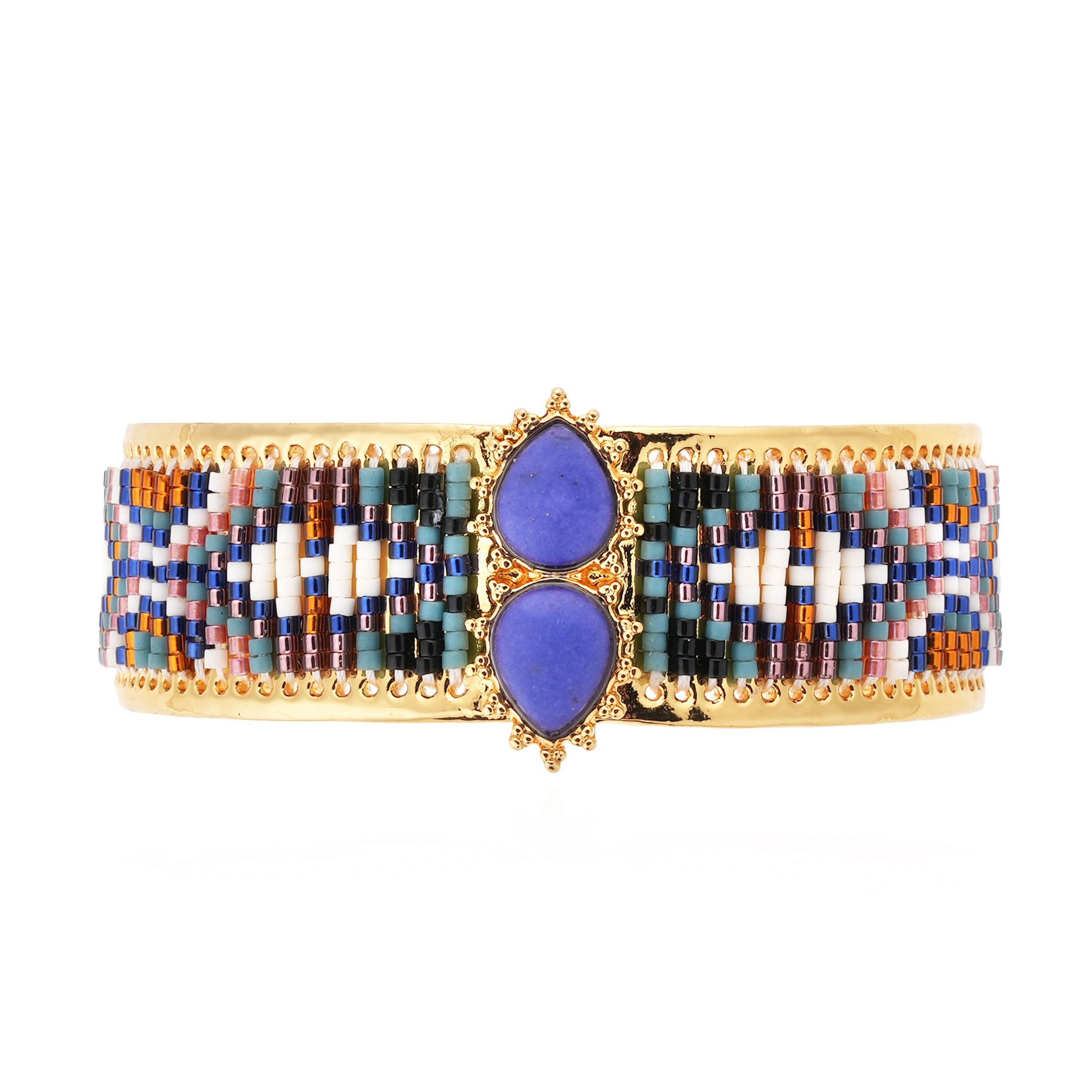 Entièrement réalisé à la main, le bracelet jonc FRISCO est magnifiquement tissé à la main avec des perles de rocaille qui représentent un motif graphique aux accents amérindiens. Le cabochon central, orné de deux gouttes en pierre imitation turquoise, malachite, onyx ou lapis lazuli selon la couleur, offre une palette de couleurs qui saura vous séduire.