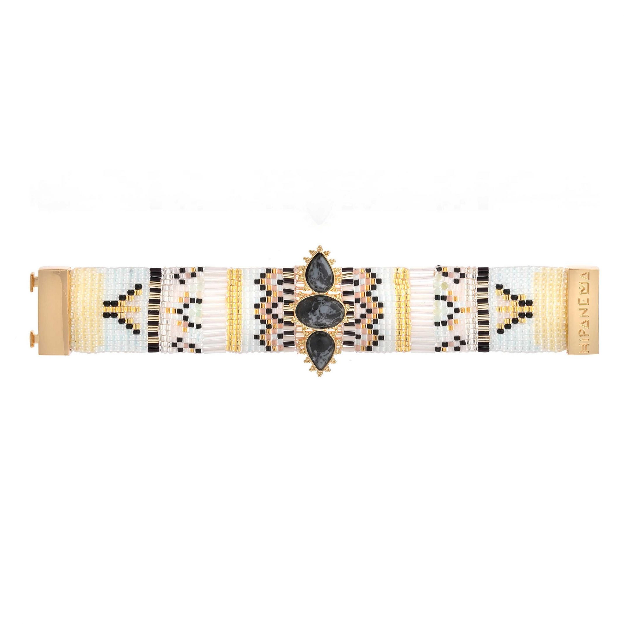 La manchette est le produit iconique Hipanema, souple et facile à mettre garce à son fermoir aimanté, le modèle NOLITI est entièrement fabriqué à la main avec un tissage des perles de rocaille et de perles de verre pour former un motif géométrique d'inspiration Navajo.