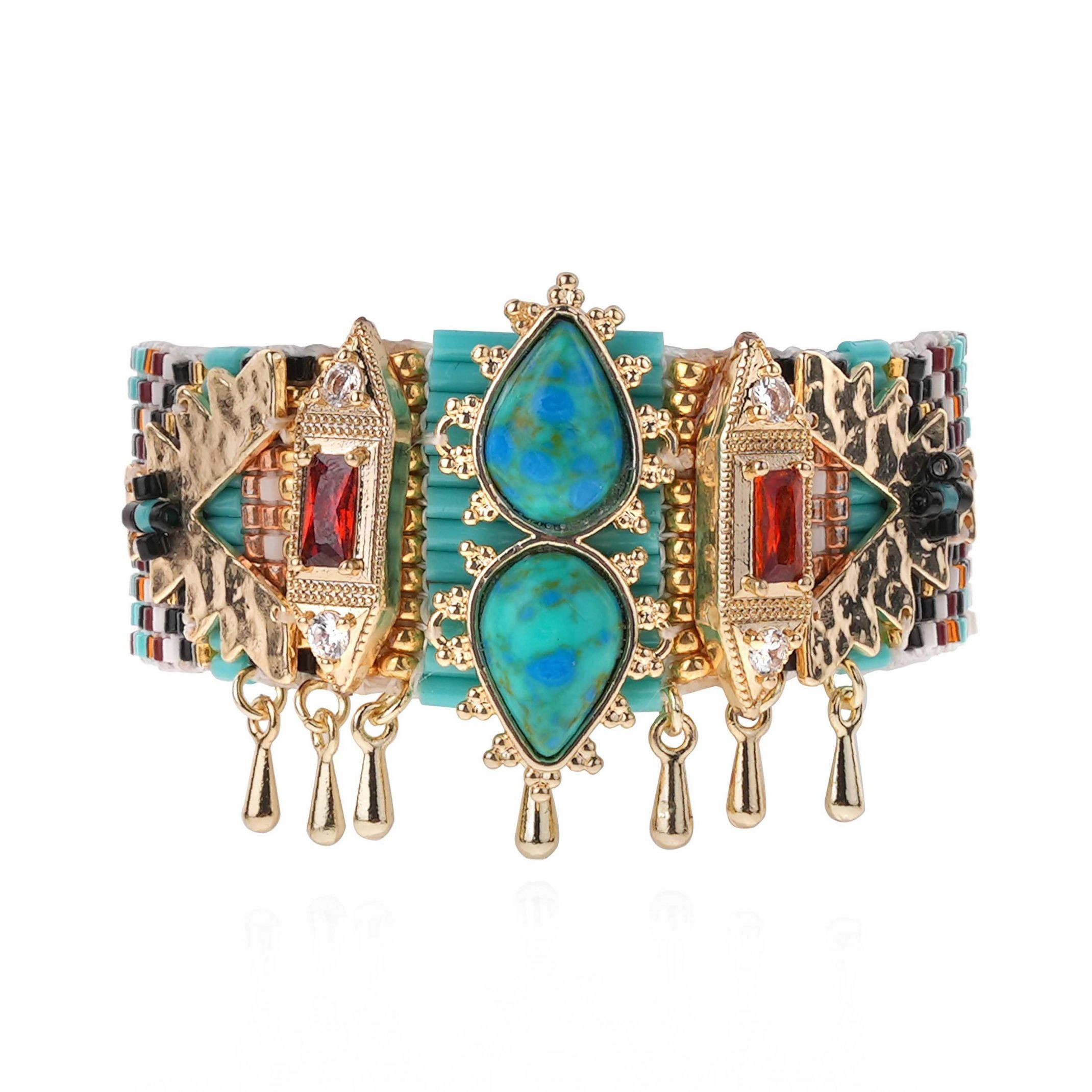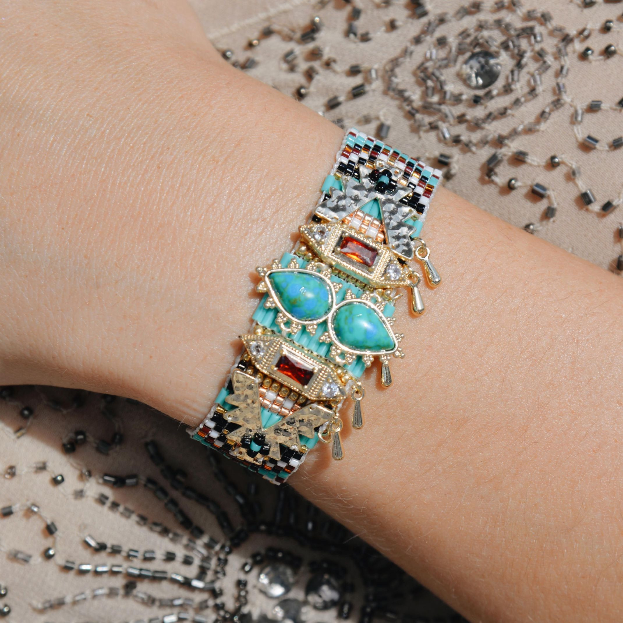 Entièrement fabriquée à la main avec son iconique fermoir aimanté doré, la manchette RANYA est la pièce d'exception de cette collection chez Hipanema et se distingue par son incroyable tissage de perles aux différents calibres, tubes, rondes et carrées, dans des nuances de bleu lapis, rouge, bronze, turquoise et blanc ivoire pour la version indigo et des nuances de noir, turquoise, blanc et doré pour la version turquoise.