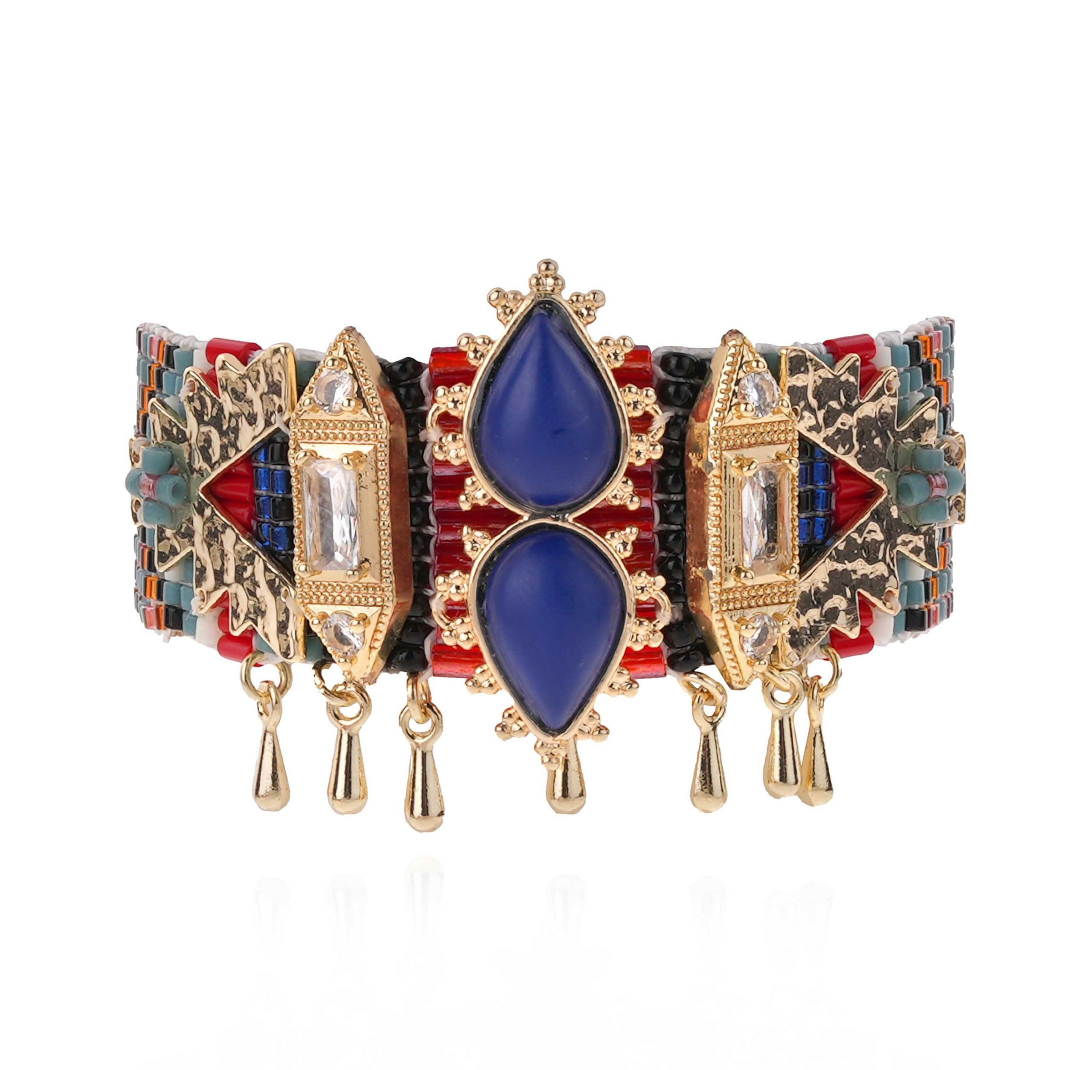 Entièrement fabriquée à la main avec son iconique fermoir aimanté doré, la manchette RANYA est la pièce d'exception de cette collection chez Hipanema et se distingue par son incroyable tissage de perles aux différents calibres, tubes, rondes et carrées, dans des nuances de bleu lapis, rouge, bronze, turquoise et blanc ivoire pour la version indigo et des nuances de noir, turquoise, blanc et doré pour la version turquoise.