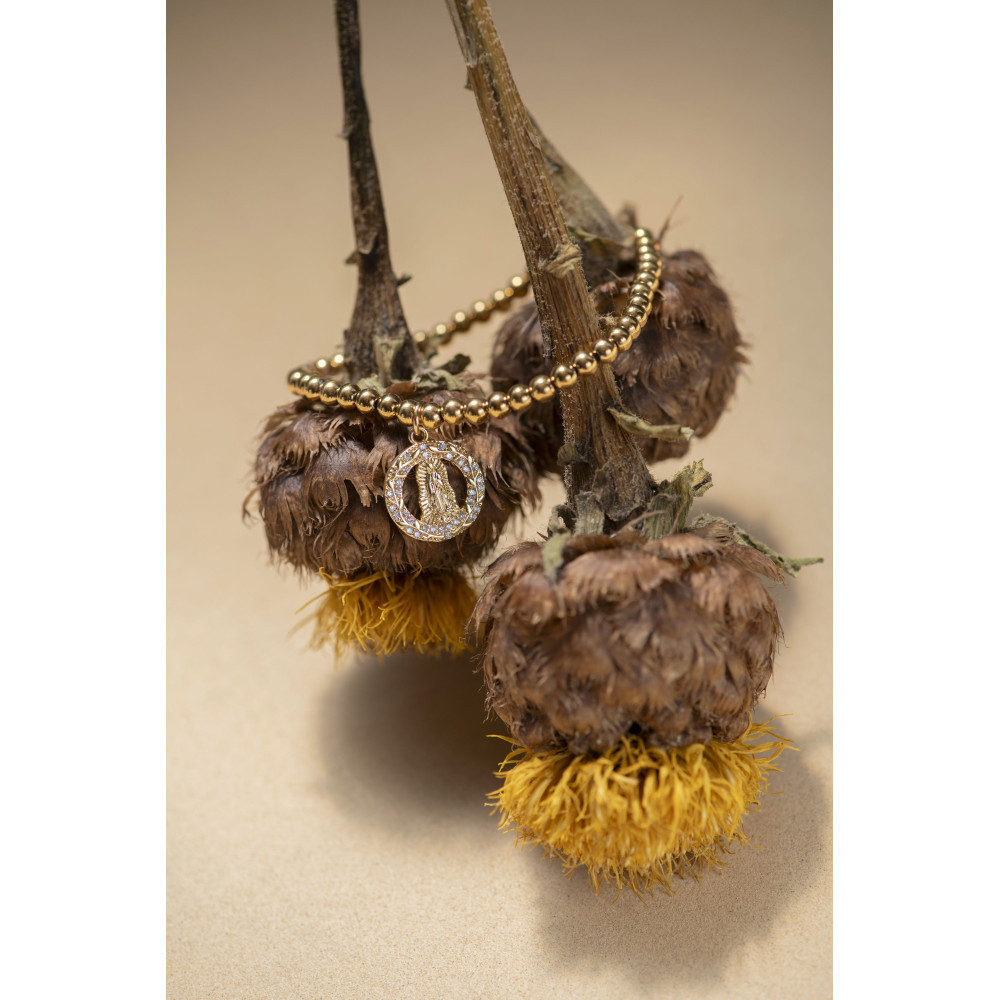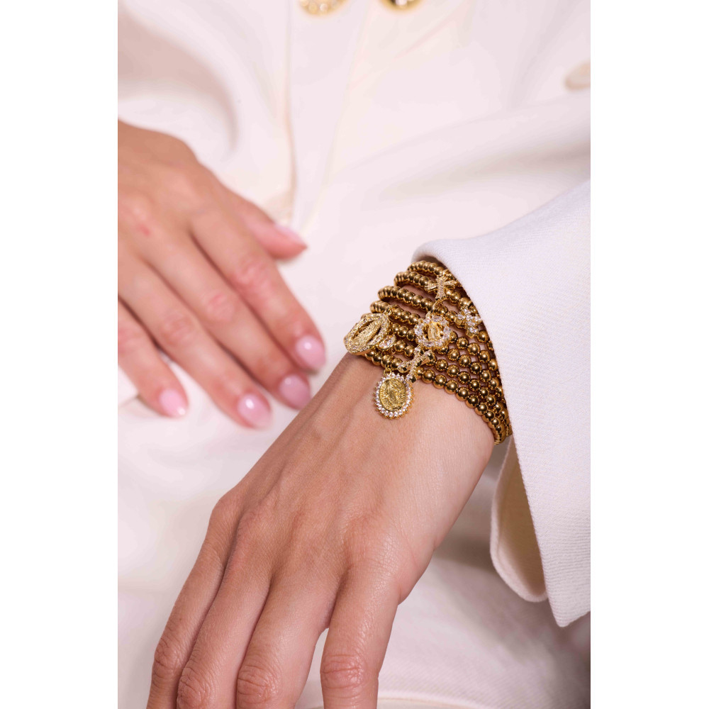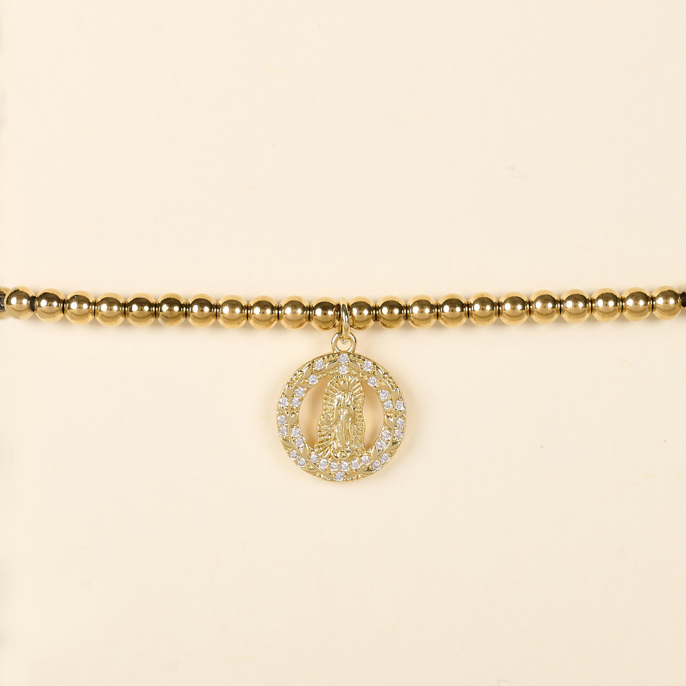Le bracelet IGOR VIERGE GRANDE est composé de petites perles en acier inoxydable doré montées sur un élastique avec un délicat pendentif rond en forme de vierge en oxyde de zirconium. Ce bijou au style minimaliste et précieux apporte une touche lumineuse et symbolique.