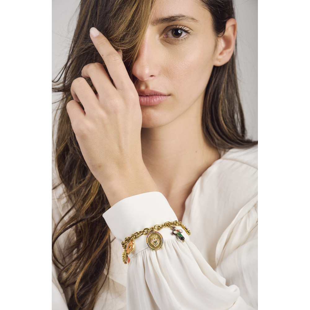 Le bracelet JAVI BLEU est composé d'une chaine en acier inoxydable doré à maillons ovales et de plusieurs pendentifs symboliques: une vierge aux strass multicolores, une pierre en quartz rose, un coeur de lumière strié, une coquillage.