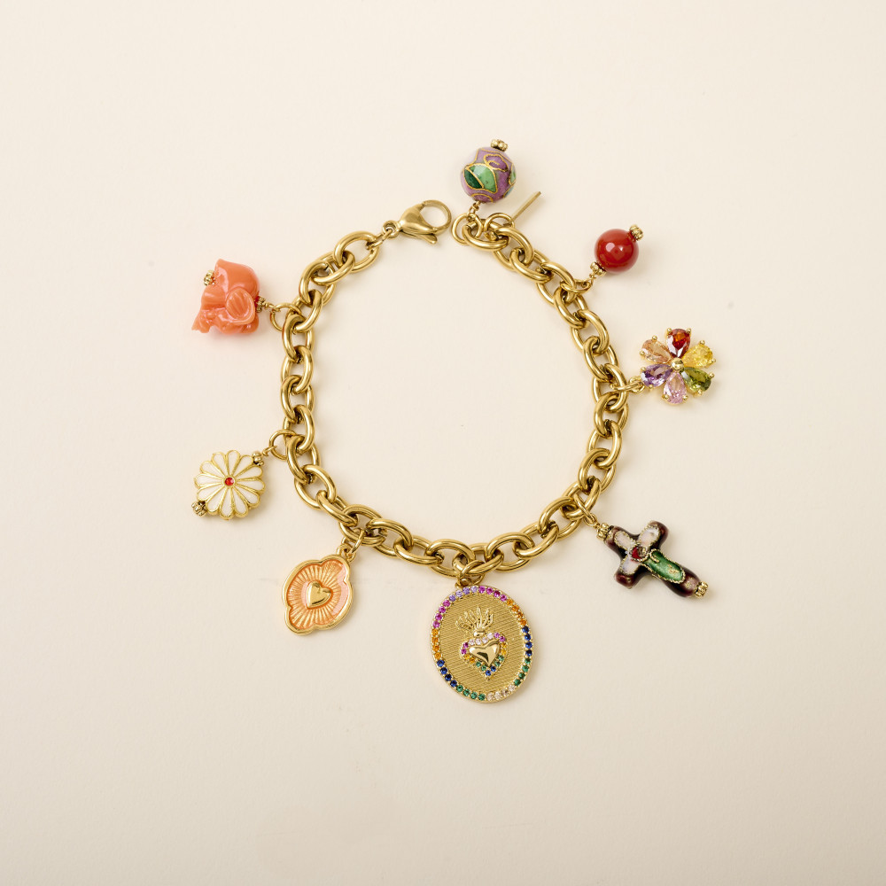 Le bracelet JAVI MULTI est composé d'une chaine en acier inoxydable doré à maillons ovales et de plusieurs pendentifs symboliques: une médaille ex-voto aux strass multicolores, une fleur cloisonnée émaillée, une fleur en oxyde, un éléphant en résine orange clair et des perles en corail et en émail cloisonné.