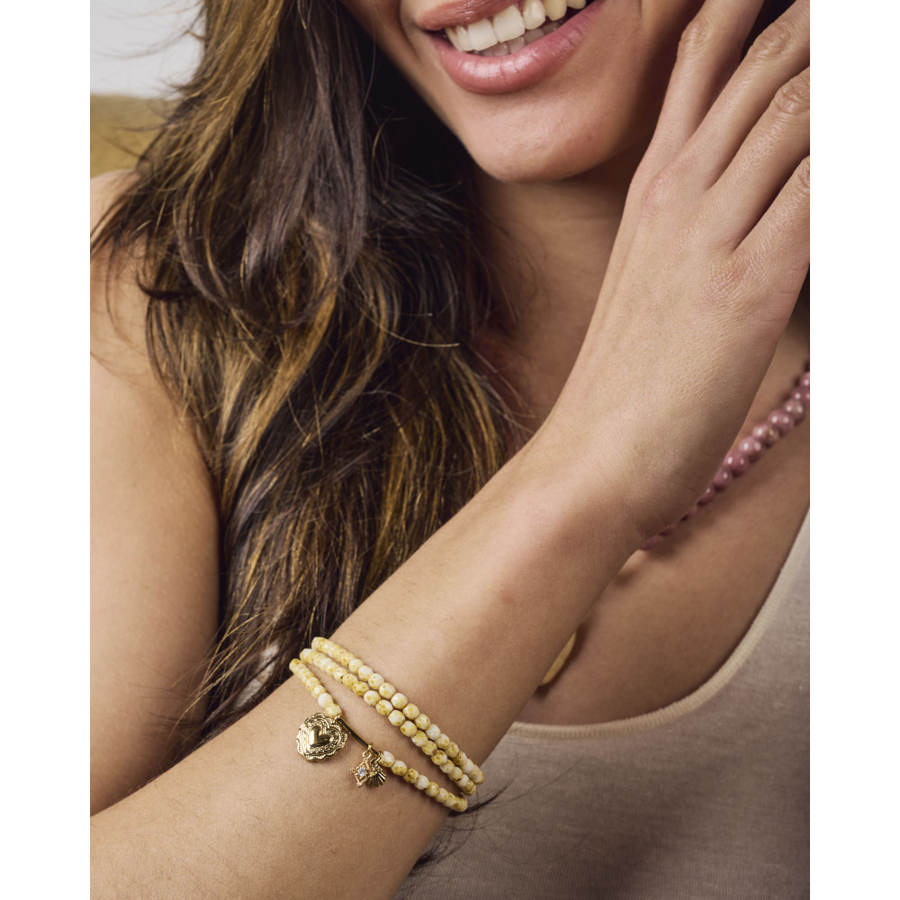 Le bracelet IMAN IVOIRE est composé d'un assemblage de perles en cristal de bohème montées sur un élastique trois tours facile à enfiler et à retirer. Il peut également reporter en collier.