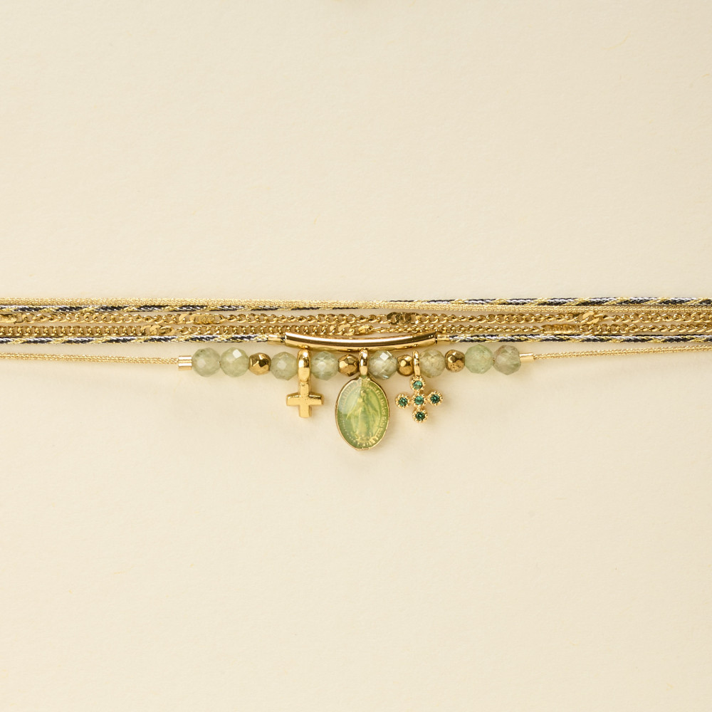 Ici rehaussé et sublimé avec des pierres naturelle et des pendentifs croix dorée et croix sertie d'oxydes avec un pendentif vierge émaillée pour apporter une touche précieuse et lumineuse à ce bracelet que vous n'allez plus quitter.