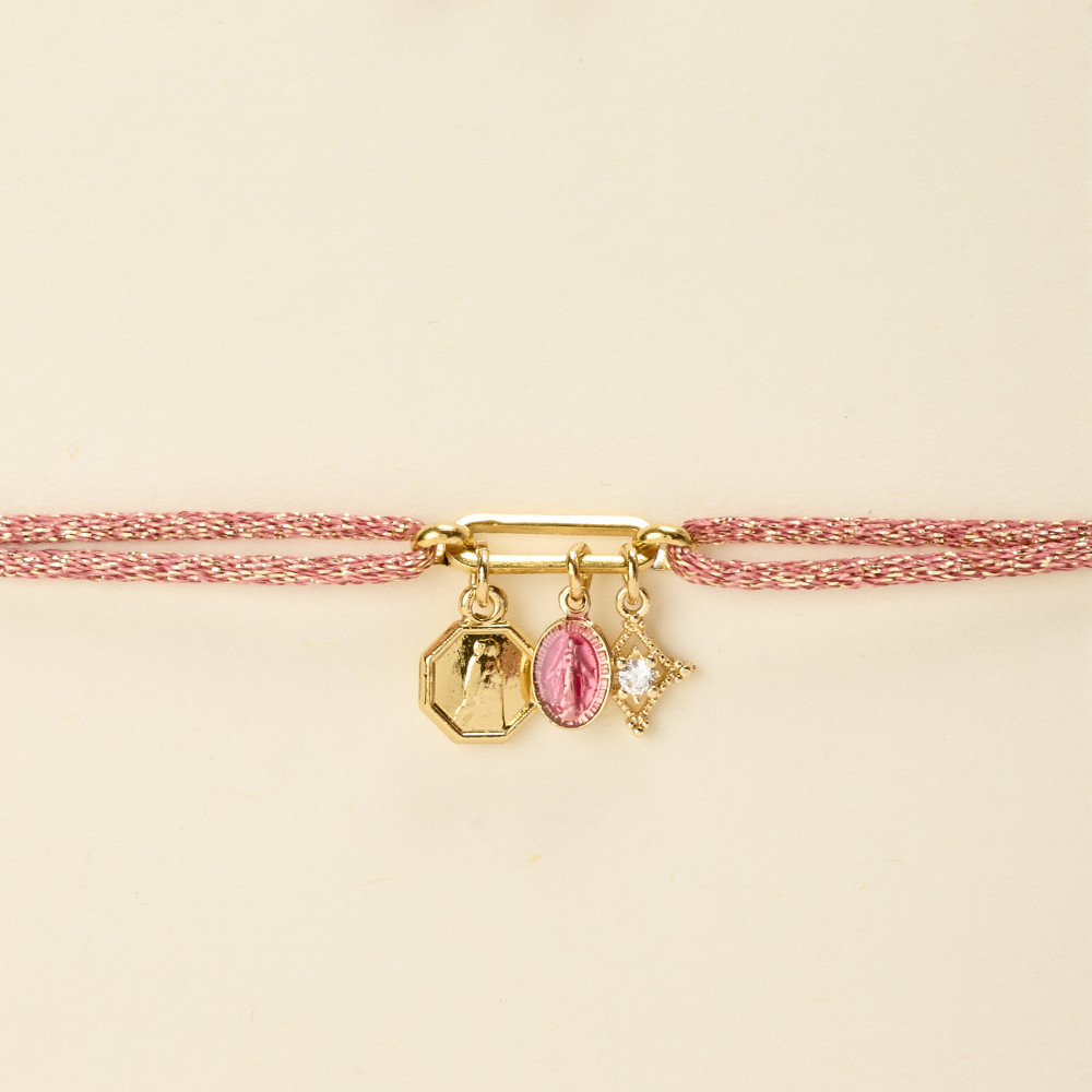 Le bracelet INDI est monté sur un lien coulissant en lurex rose, orné d'un médaillon central ovale avec des médailles symboliques.
