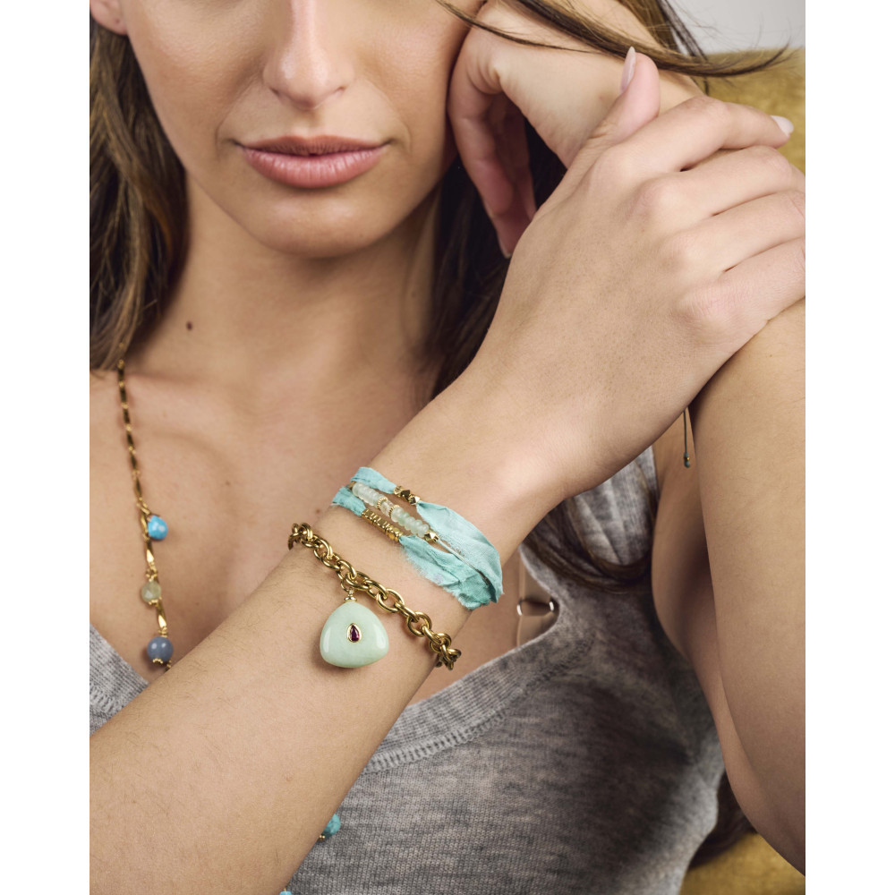 Le bracelet BRUNA est constitué de trois liens de tissu en soie déchirée issue de chutes de sari, clin d'oeil à l'Inde, avec un enfilage de perles en pierres naturelles et perles dorées.