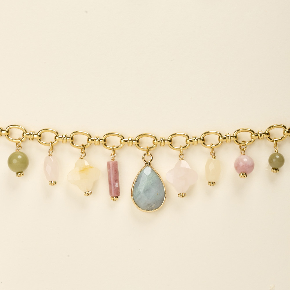 Les pierres: Quartz rose, Amazonite, Rhodonite, Agate verte, Agate jaune.