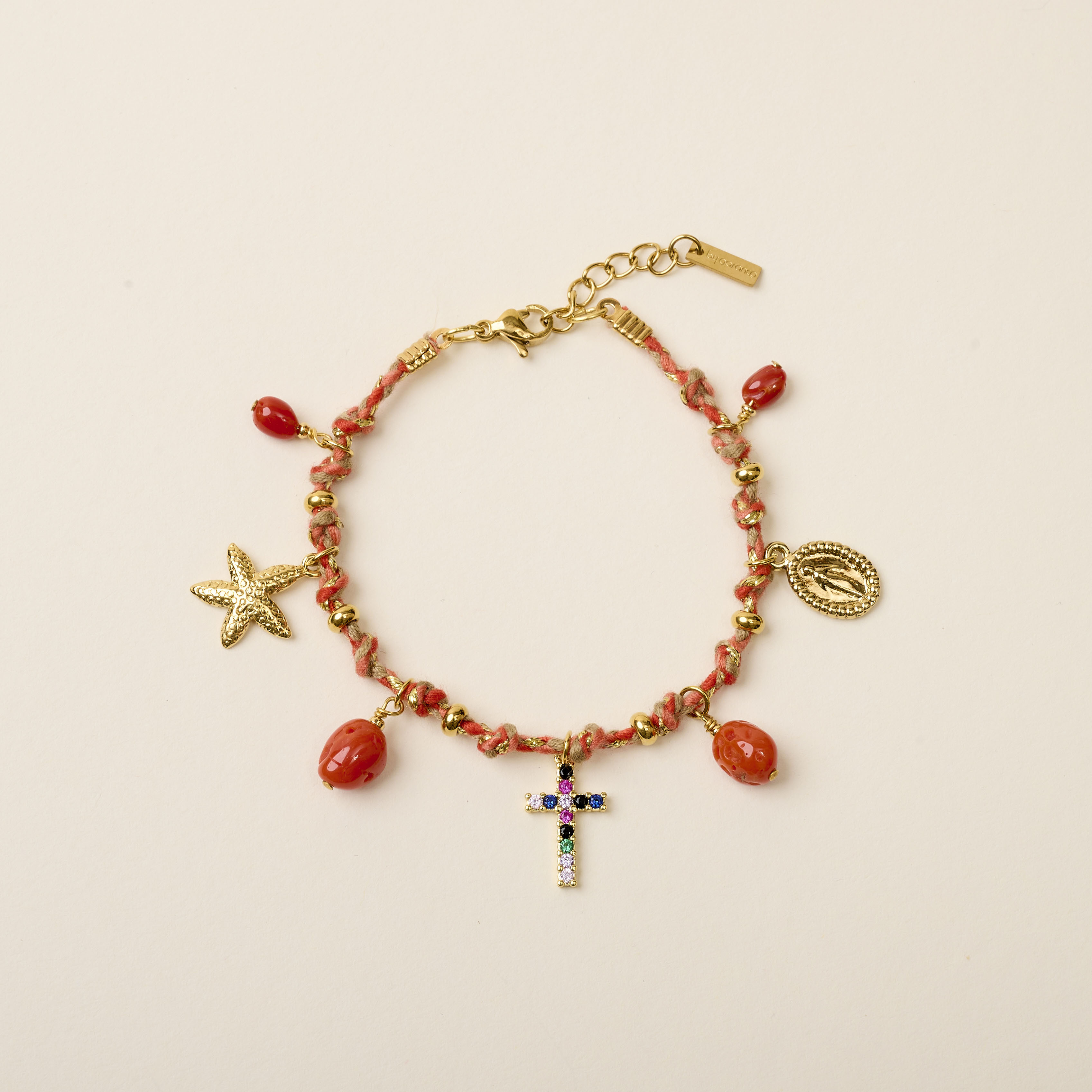 Le bracelet RAFA CORAIL CROIX MULTI est composé d'un lien tressé aux nuances de corail beige et lurex doré noué avec en alternance des médailles symboliques, une croix sertie d'oxydes multicolores et des perles en Corail Bambou.