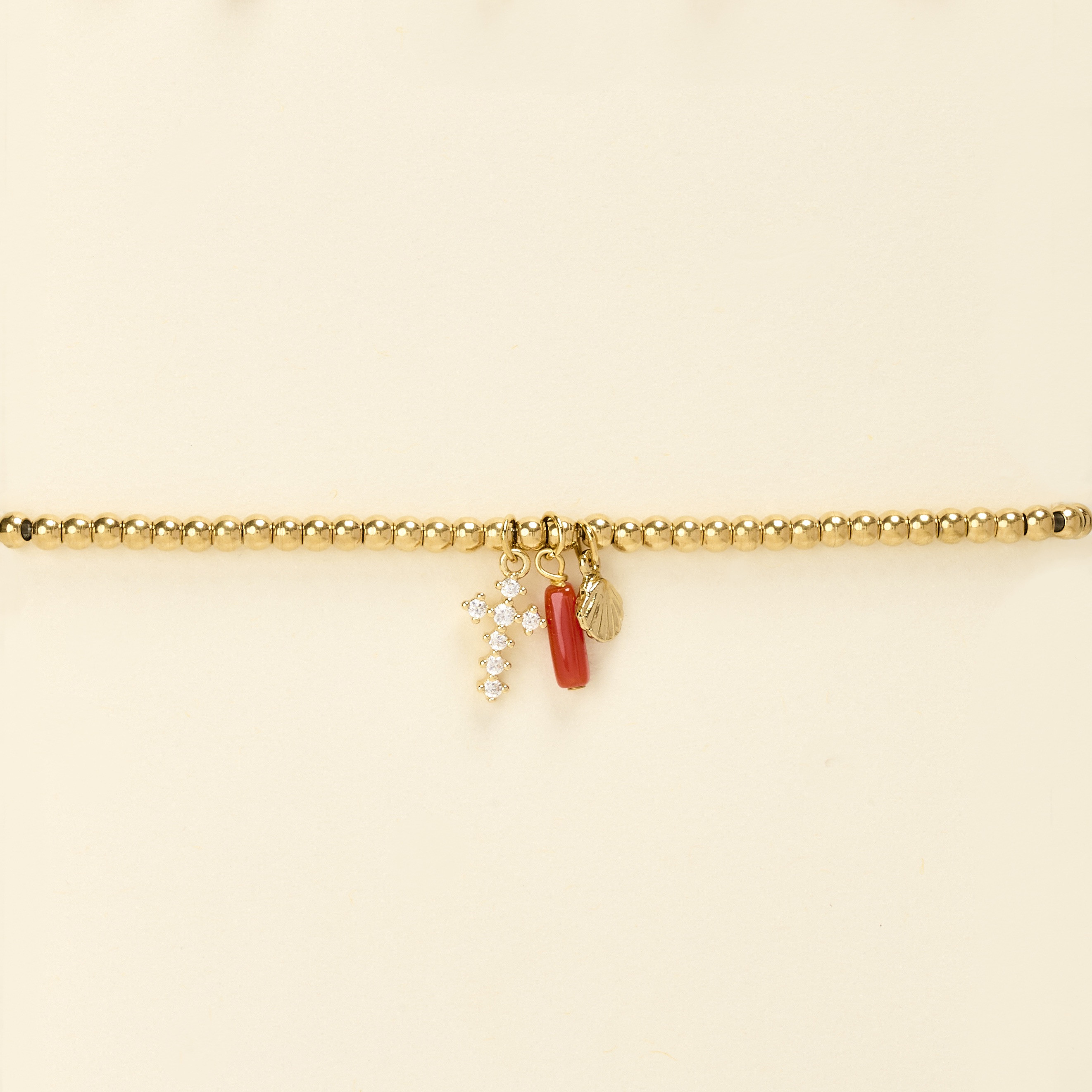 Le bracelet ROXY CORAIL PETITE CROIX est composé de petites perles en acier inoxydable doré montées sur un élastique avec un délicat pendentif en forme de croix en oxyde de zirconium et une perles en corail bambou. Ce bijou au style minimaliste et précieux apporte une touche lumineuse et symbolique.