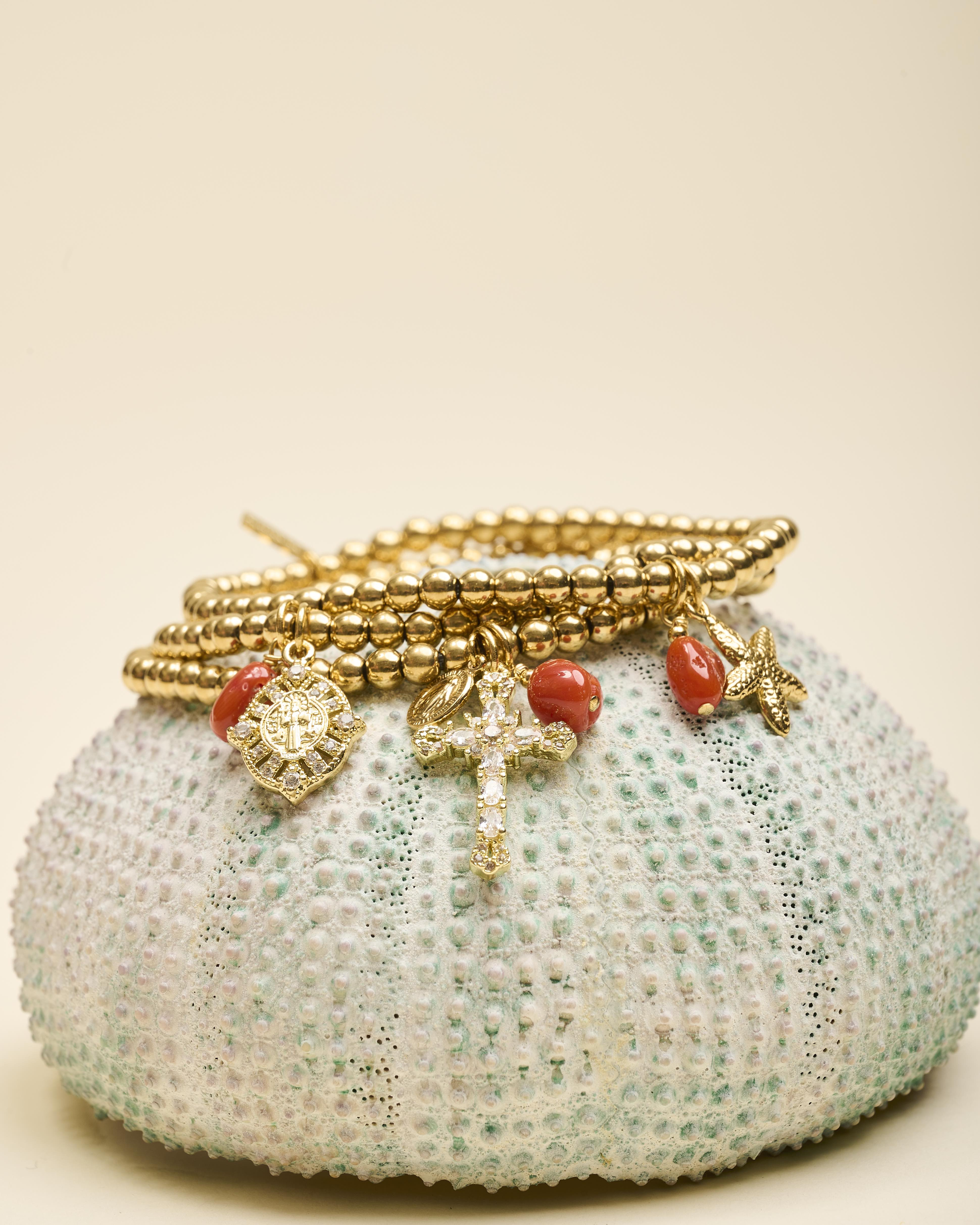 Le bracelet ROXY CORAIL VIERGE est composé de petites perles en acier inoxydable doré montées sur un élastique avec un délicat pendentif ovale cerclé d'oxyde au motif central vierge et une perles en corail bambou. Ce bijou au style minimaliste et précieux apporte une touche lumineuse et symbolique.