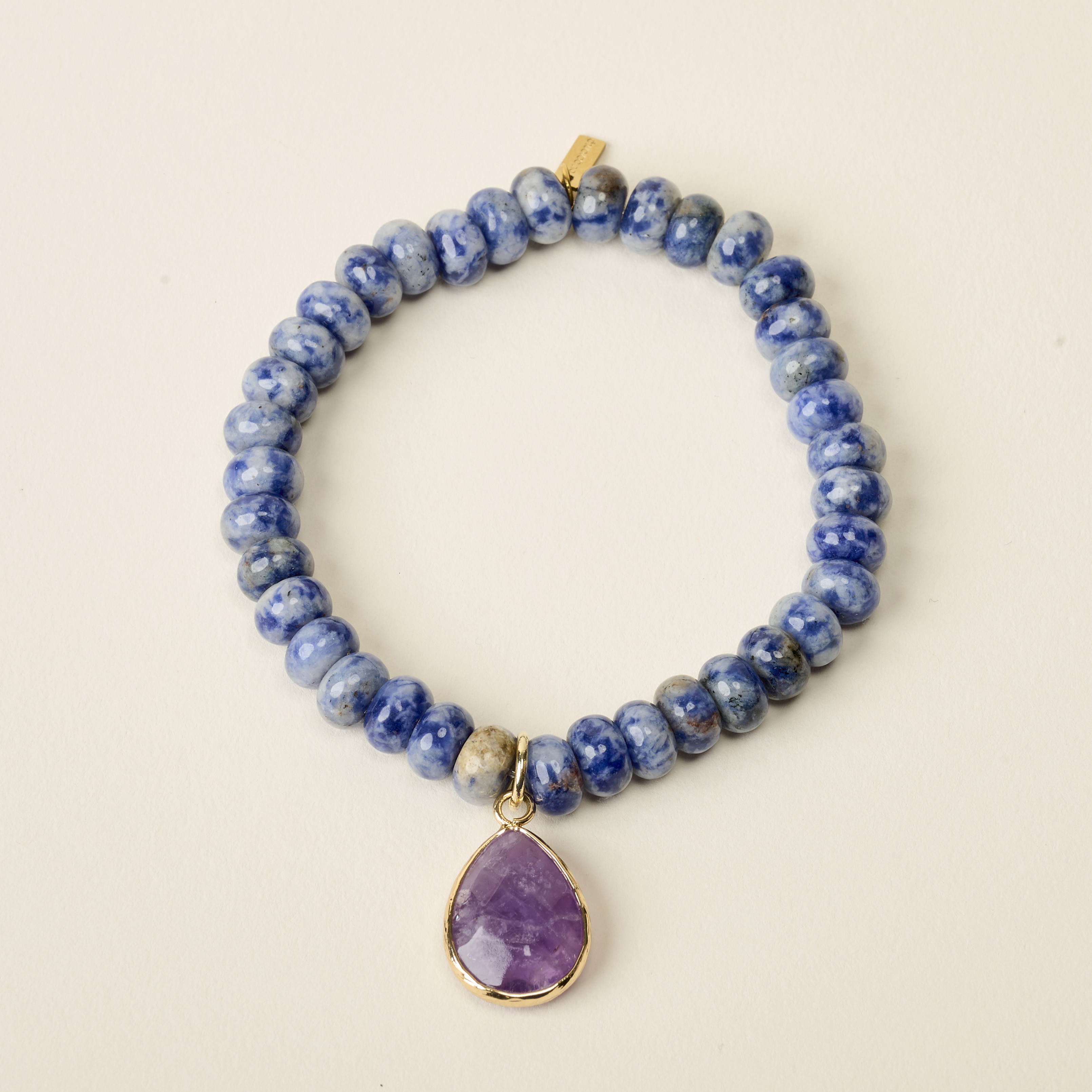 Le bracelet AADA SODALITE est composé de perles rondes de 8mm de diamètre, avec un pendentif central en Améthyste en forme de goutte cerclée de doré .