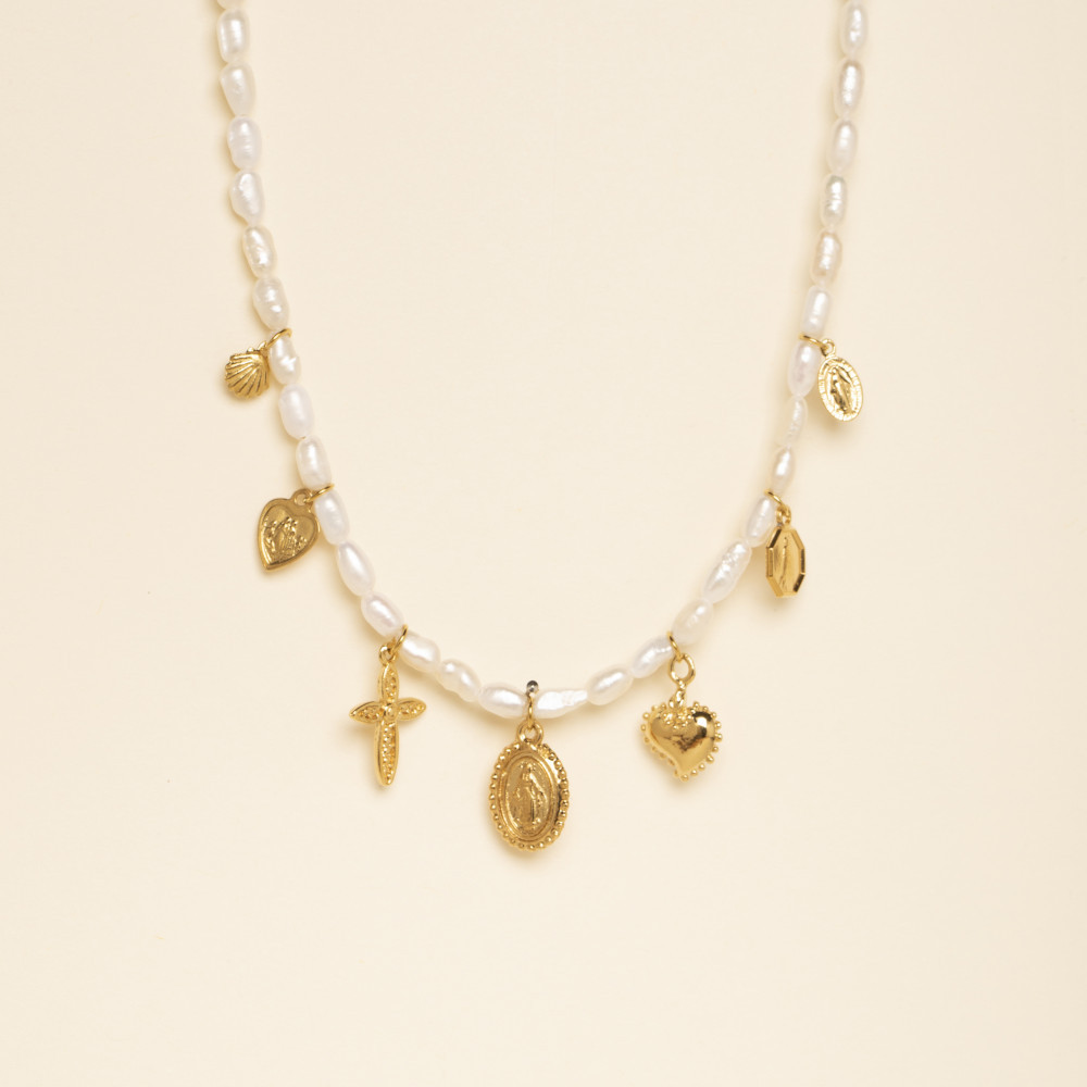 Le collier By Garance Isla Vierge est composé d'un enfilage de perles de culture d'eau douce avec de jolies pampilles dorées en laiton à l'effigie de la vierge.