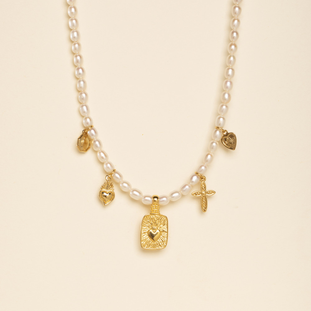 Le collier By Garance Isla Ex-Voto est composé d'un enfilage de perles de culture d'eau douce avec de jolies pampilles en laiton doré en forme de croix et d'ex-voto.