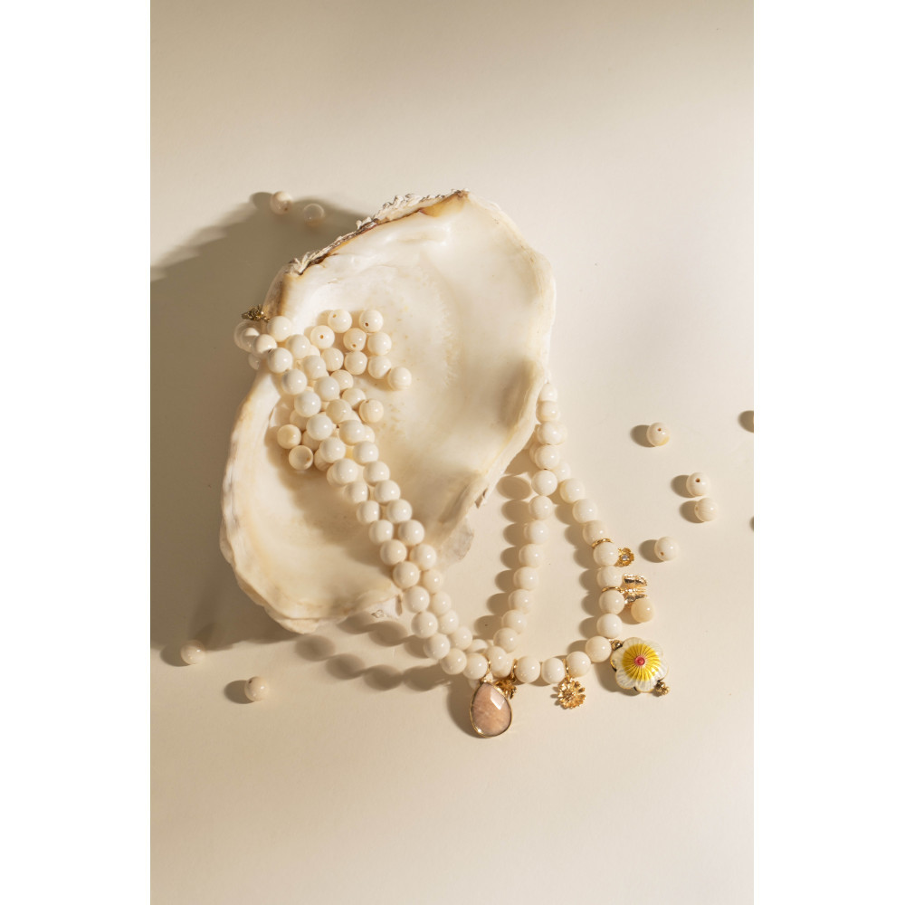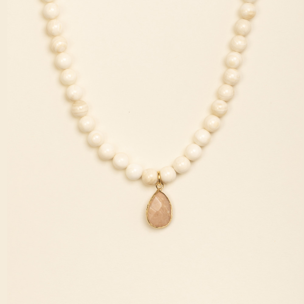 Collier By Garance Dori Rose composé d'un enfilage de perles en jaspe blanc et d'un pendentif en pierre de lune couleur pêche serti en forme de goutte