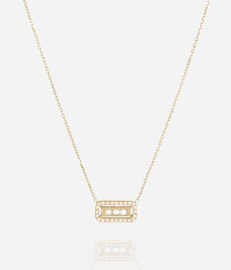 Collier ZAG modèle CLÉOPHÉE en acier inoxydable doré avec un pendentif en forme de rectangle serti de zirconiums avec 3 zirconiums à l'intérieur.