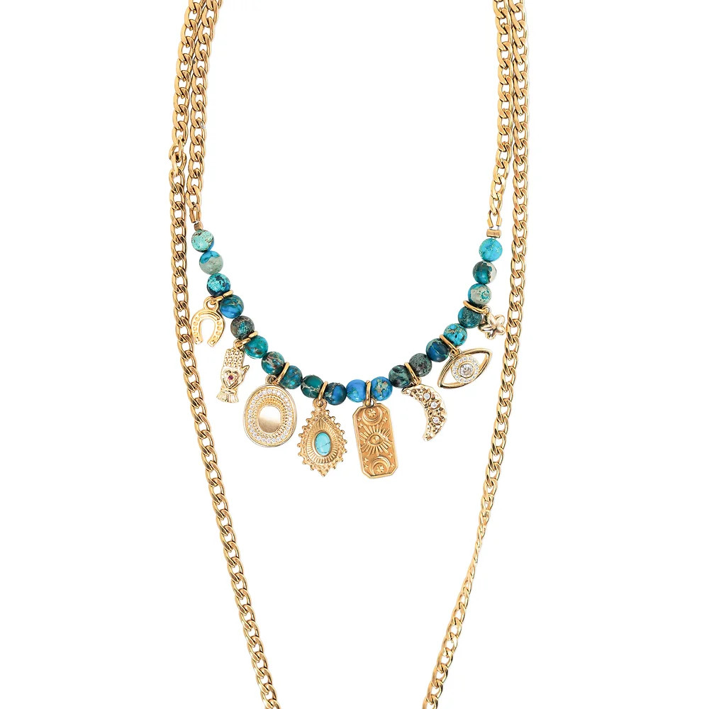 Le collier Arizona Blue Cravate se porte en ras de cou sur la partie avec les pendentifs et les perles bleues en jaspe impérial, et une longue chaine dorée que l'on noue sur le devant comme une cravate.