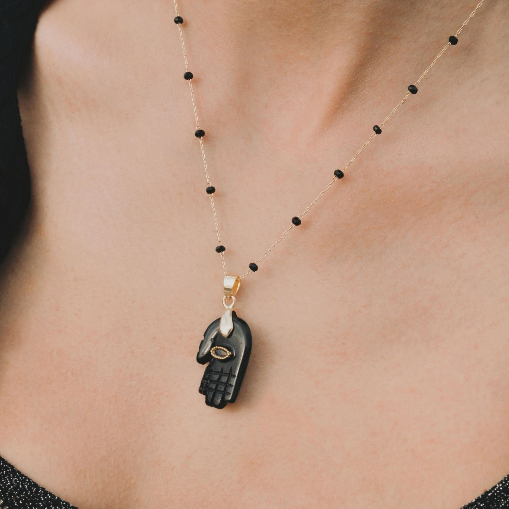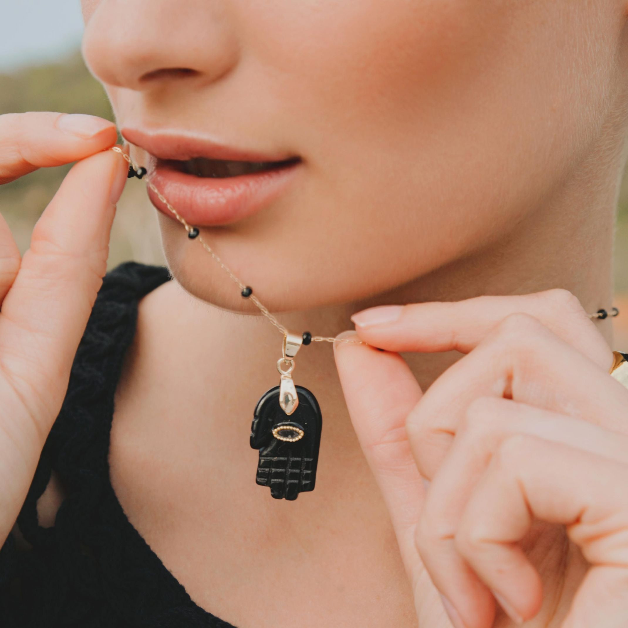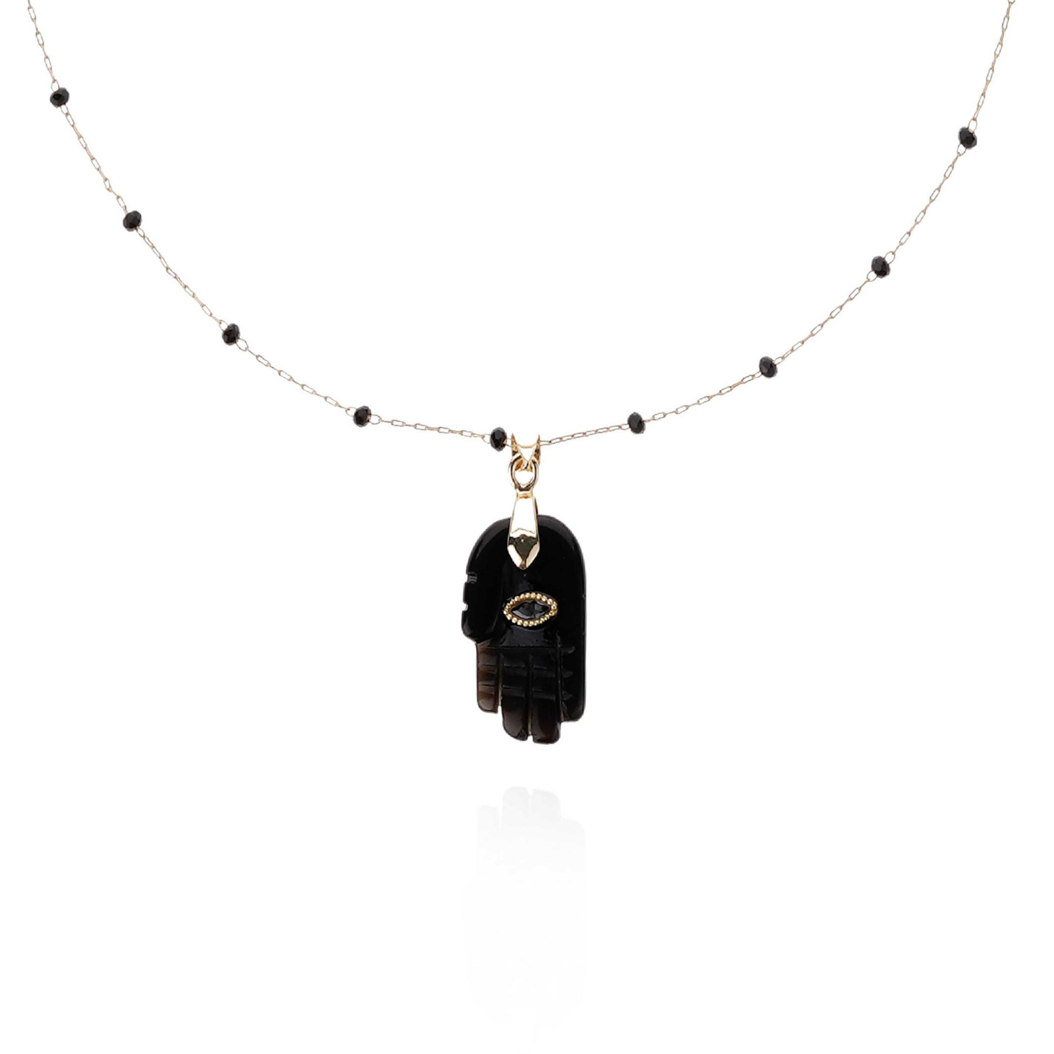 Entièrement fabriqué à la main, le collier KIKA NOIR est composé d'une délicate chaine chapelet avec des perles effet onyx et un pendentif en forme de main noire protectrice sculptée dans de l'onyx et ornée en son centre d'un strass noir qui apporte une sophistication magnétique.