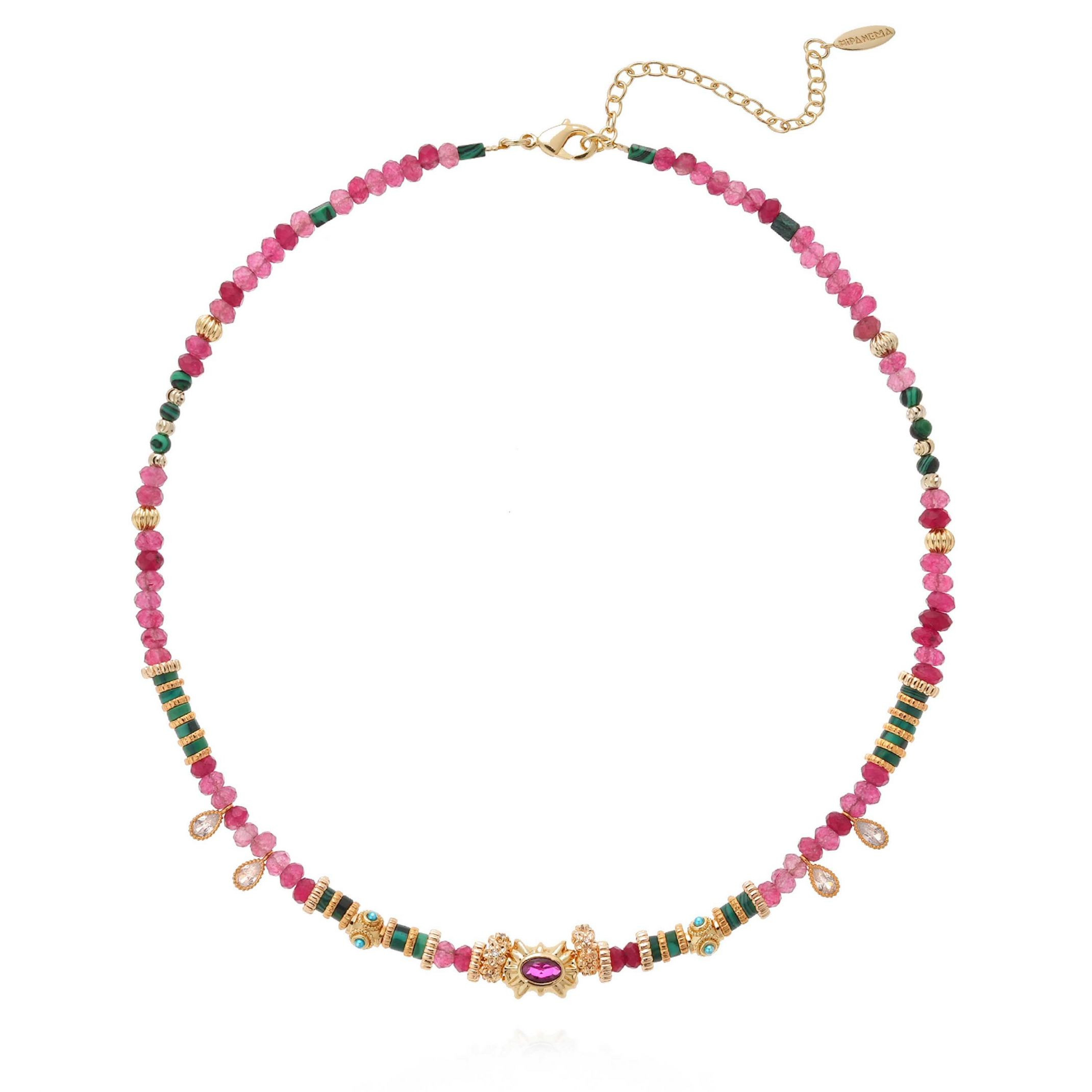 Entièrement réalisé à la main, le collier LOUKOOM ROSE est composé d'un harmonieux assemblage de perles en malachite et de perles en grenat type spinelle rose avec un élément central doré orné de strass rose qui s'inspire d'un style sophistiqué et haut en couleur.