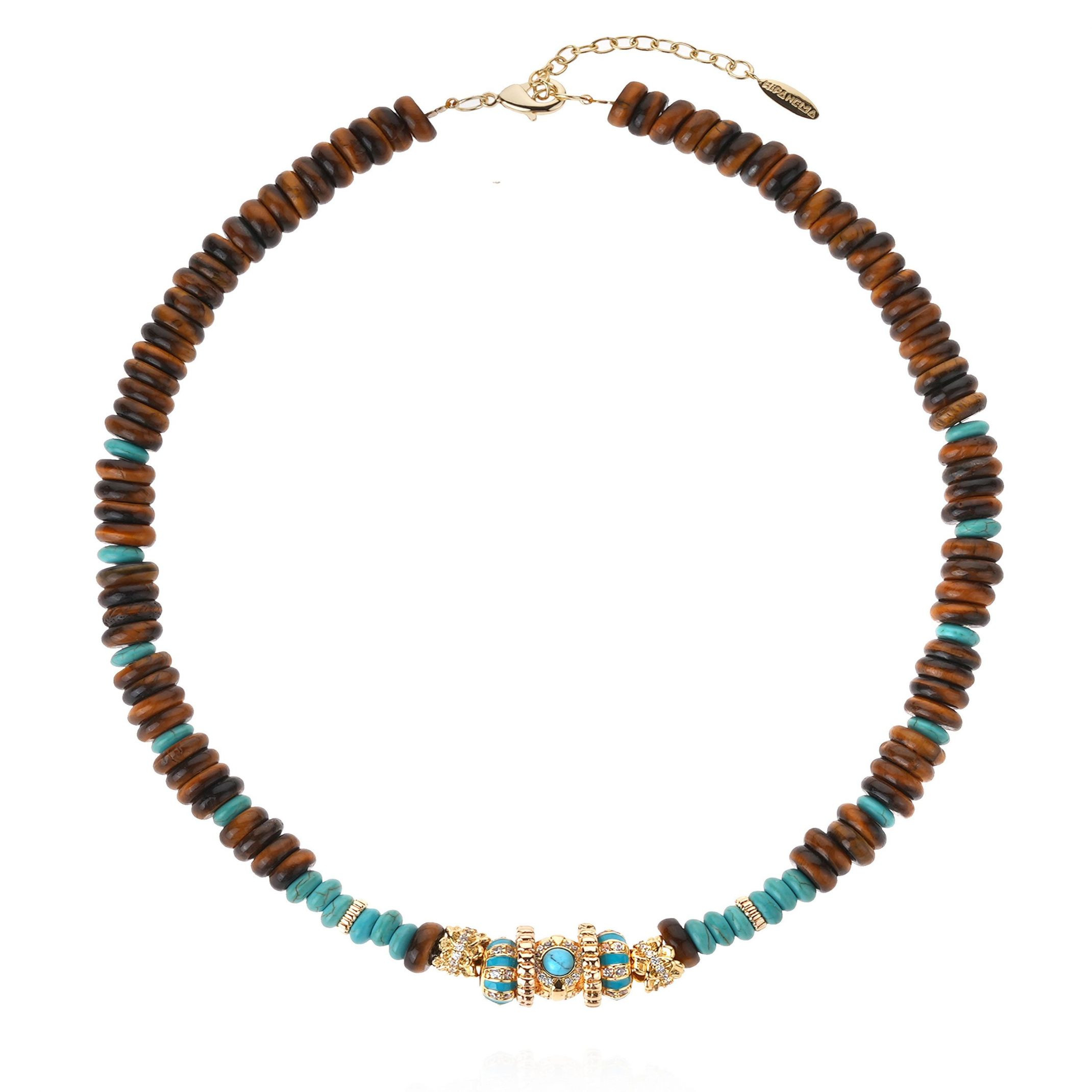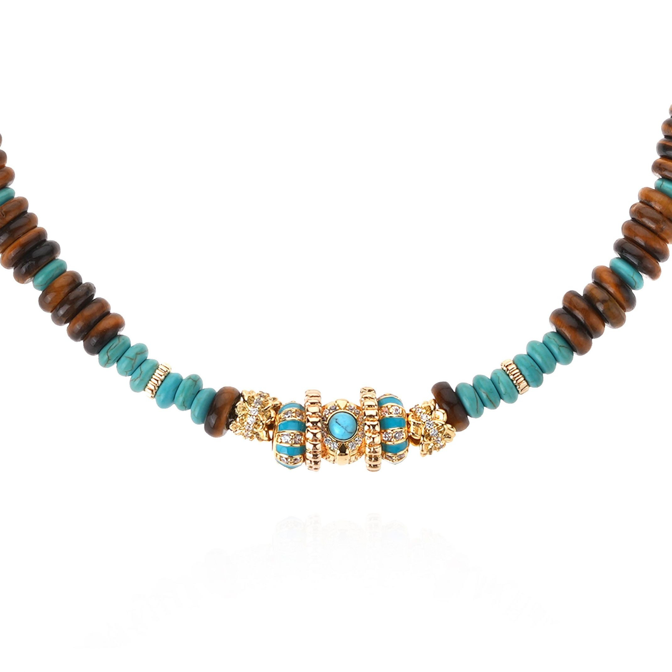 Entièrement fabriqué à la main, le collier CAYRO TERRE est un joli mélange entre précieux et tradition. Il est composé d'un enfilage de perles en rondelles en oeil de tigre et turquoise reconstituée avec un élément central empierré en strass qui apporte une touche sophistiquée et précieuse à l'ensemble.