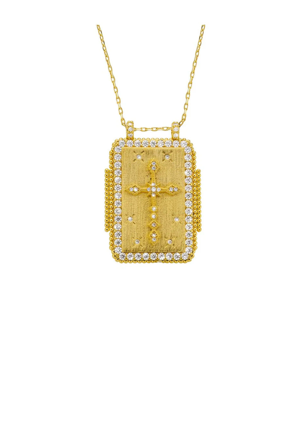 Le collier OLGA BOHÈME est composé d'une jolie chaine dorée avec un pendentif coulissant rectangulaire or brossé avec un délicat motif croix sertie d'oxydes de zirconium. Ce bijou bohème capte la lumière de ce joli motif central.