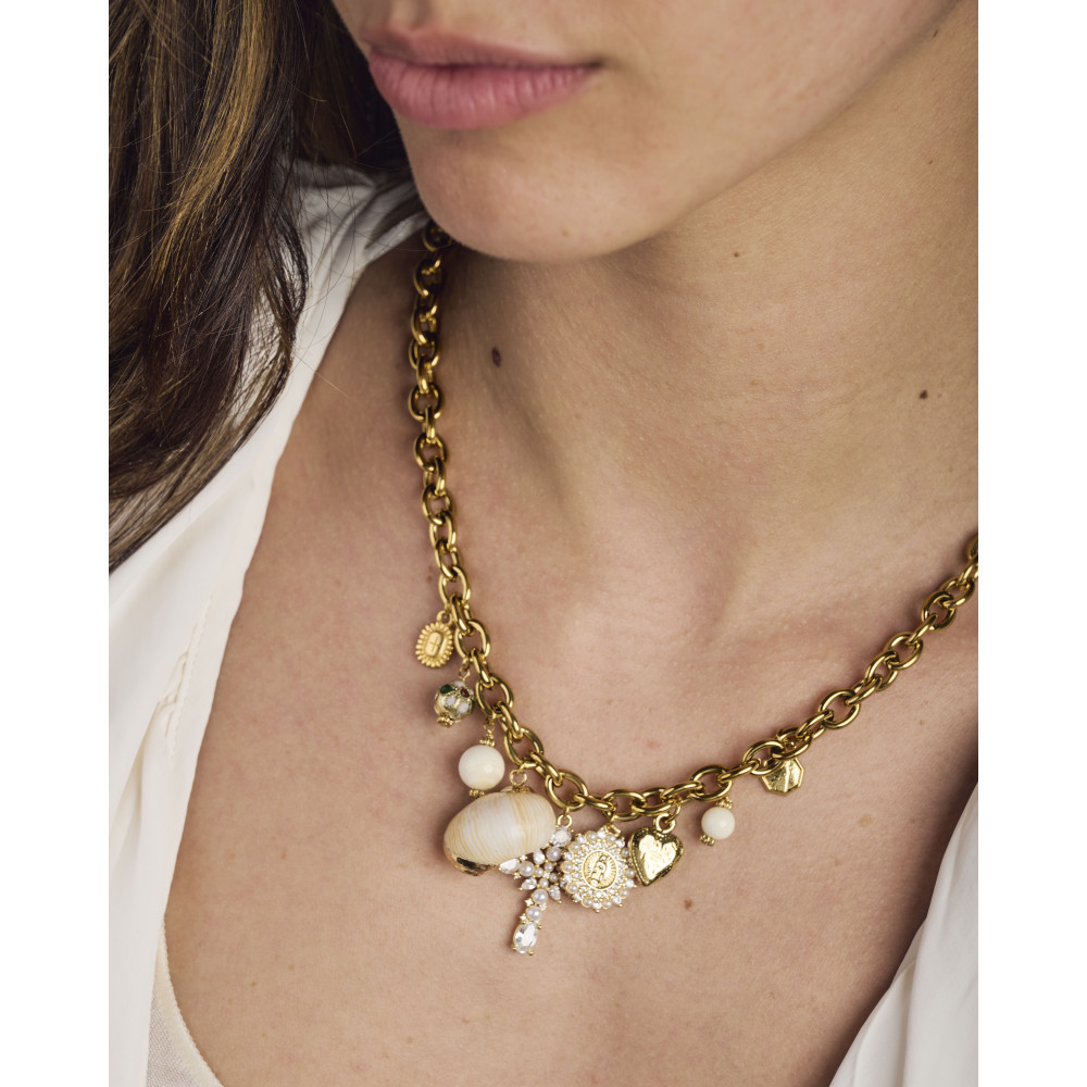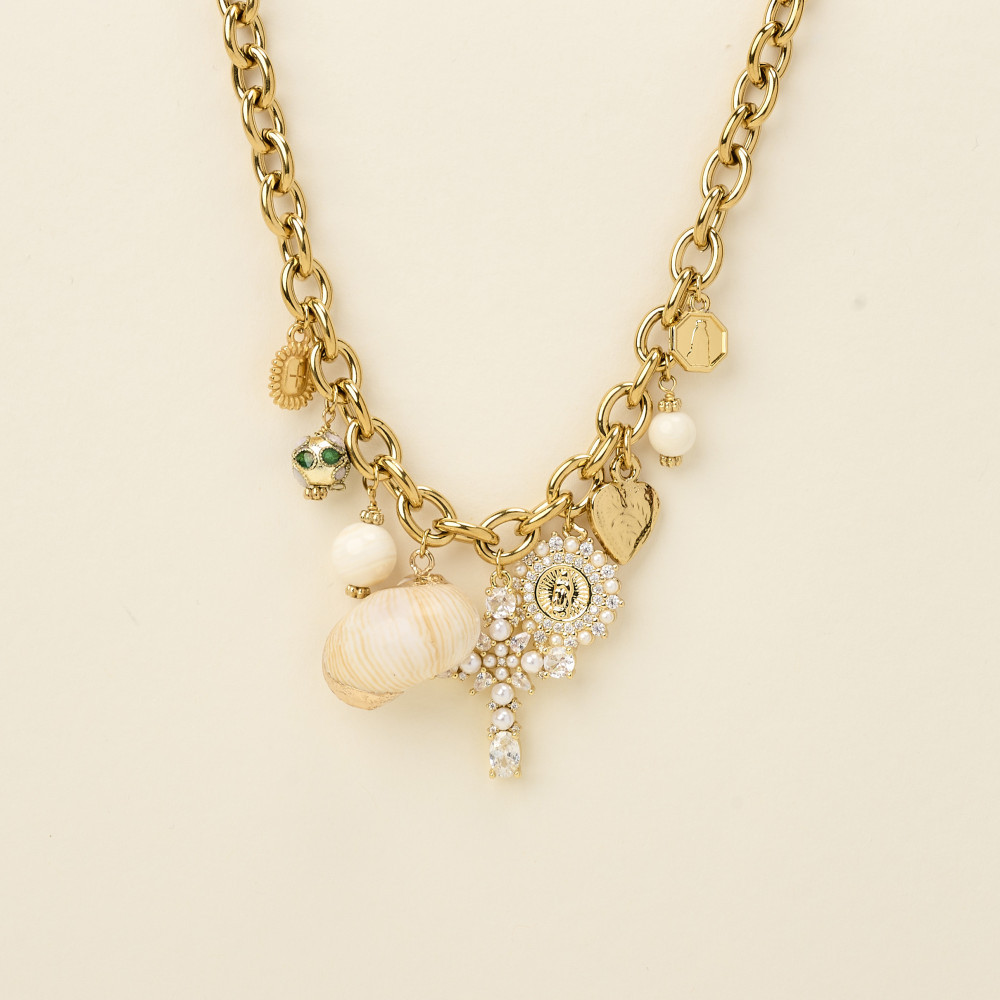 Le collier JAVI IVOIRE est composé d'une chaine en acier inoxydable à maillons ovales et de plusieurs pendentifs symboliques soigneusement assemblés pour créer un bijou original et unique: une croix perlée, un coquillage, une médaille vierge perlée ainsi que des perles en jaspe blanc qui apportent une touche lumineuse.