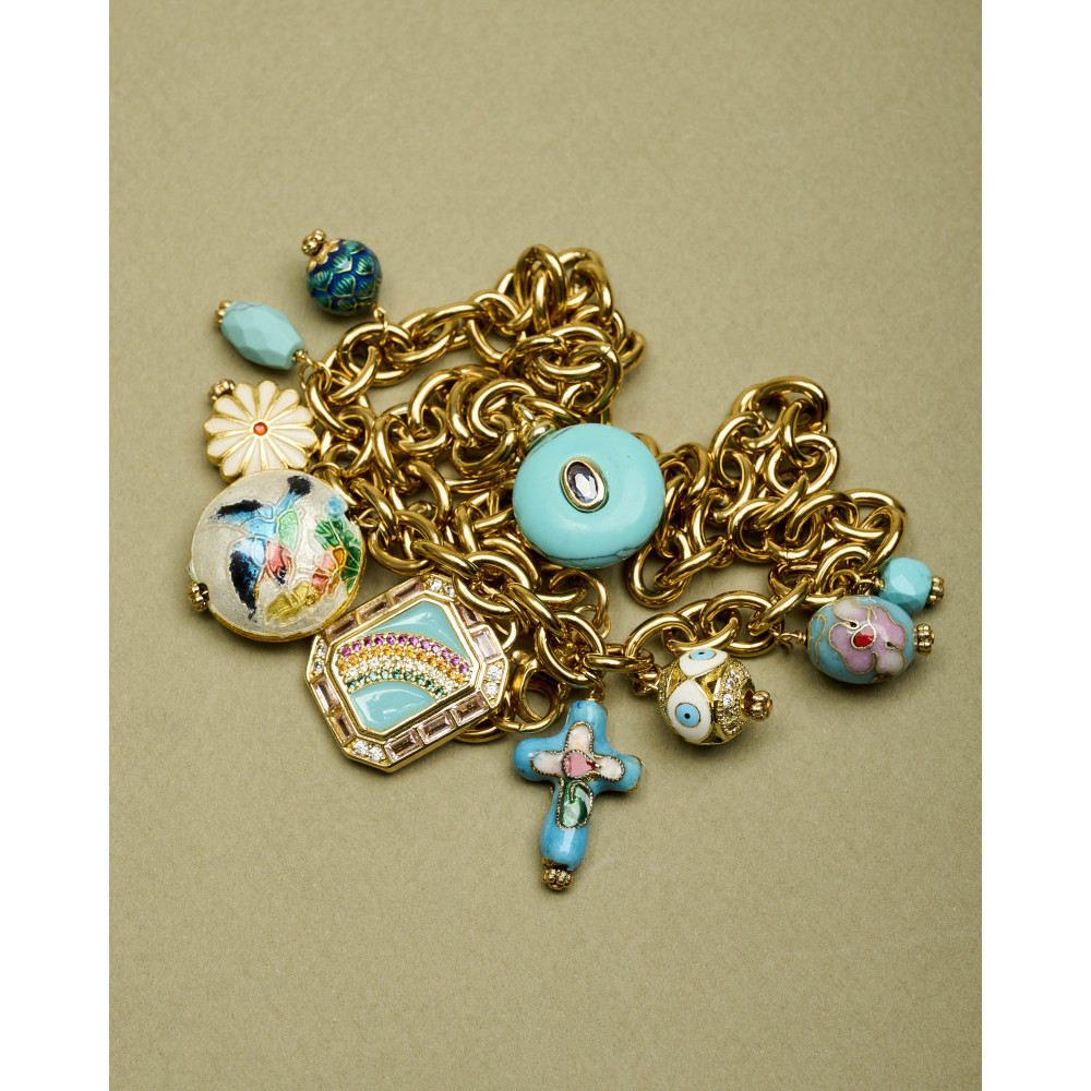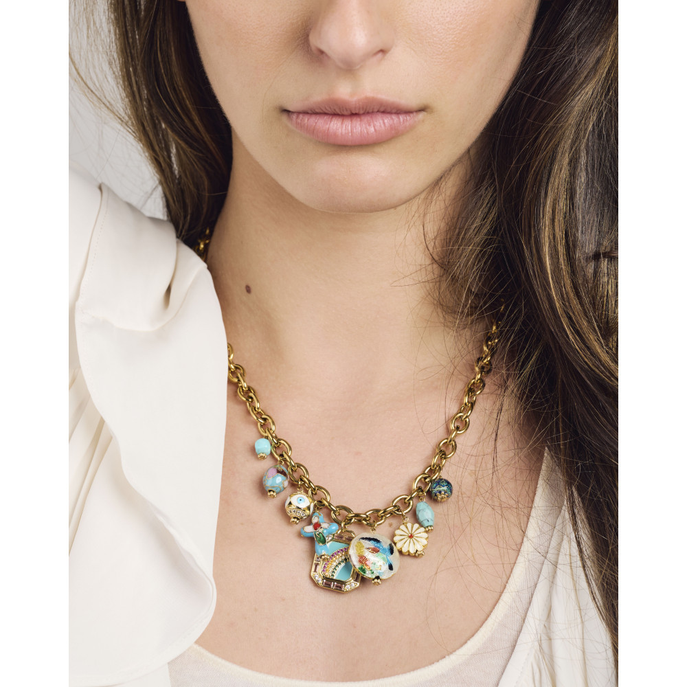 Le collier JAVI TURQUOISE est composé d'une chaine en acier inoxydable doré à maillons ovales et de plusieurs pendentifs symboliques soigneusement assemblés pour composer un bijou unique et original: une croix émaillée et des perles en émail cloisonné, une médaille centrale sertie d'oxydes multicolores et des perles en turquoise qui apportent une touche lumineuse et colorée.