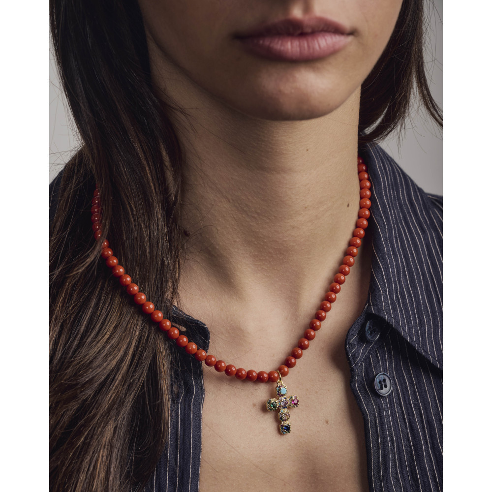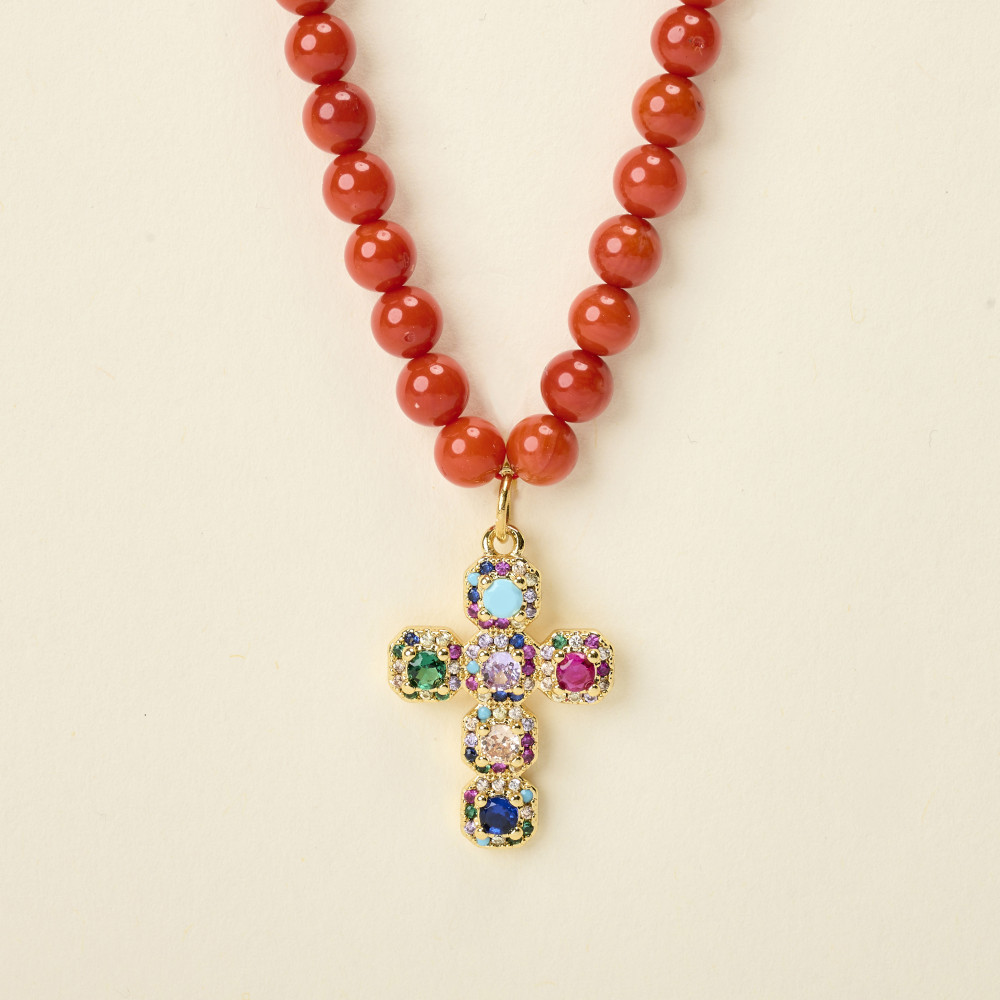 Le collier JORA CROIX MULTI est composé d'un enfilage de perles en corail bambou avec un superbe pendentif croix rehaussé d'oxydes de zirconium multicolores.