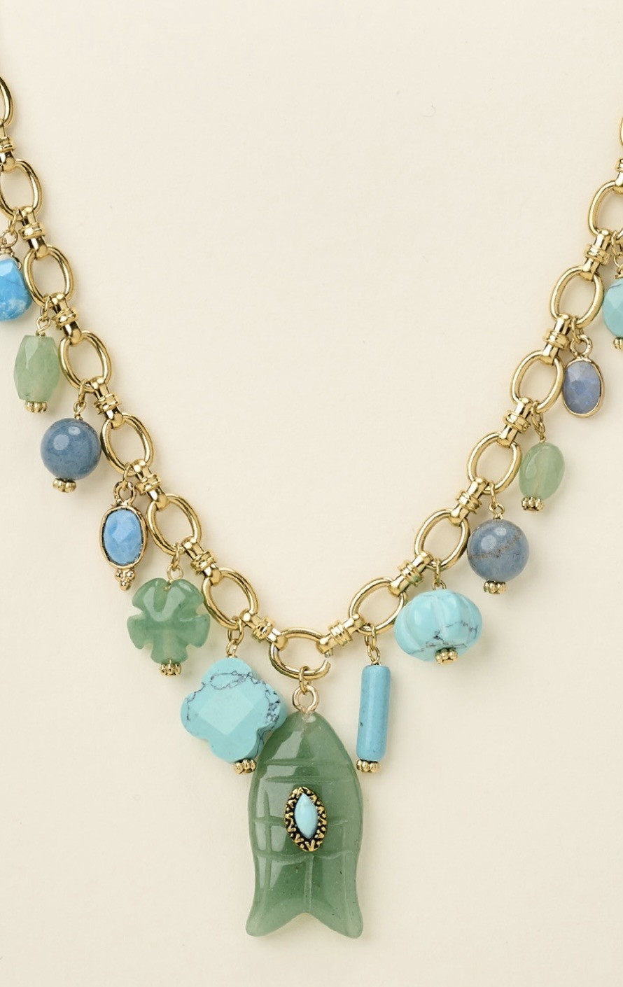 Le collier AMRA POISSON est composé d'une chaine en acier inoxydable doré à gros maillons ovales inspirés d'une maille ancienne, ornée de pierres aux nuances de vert et bleu, avec comme élément central une pierre en Agate en forme de poisson pour un look estival.