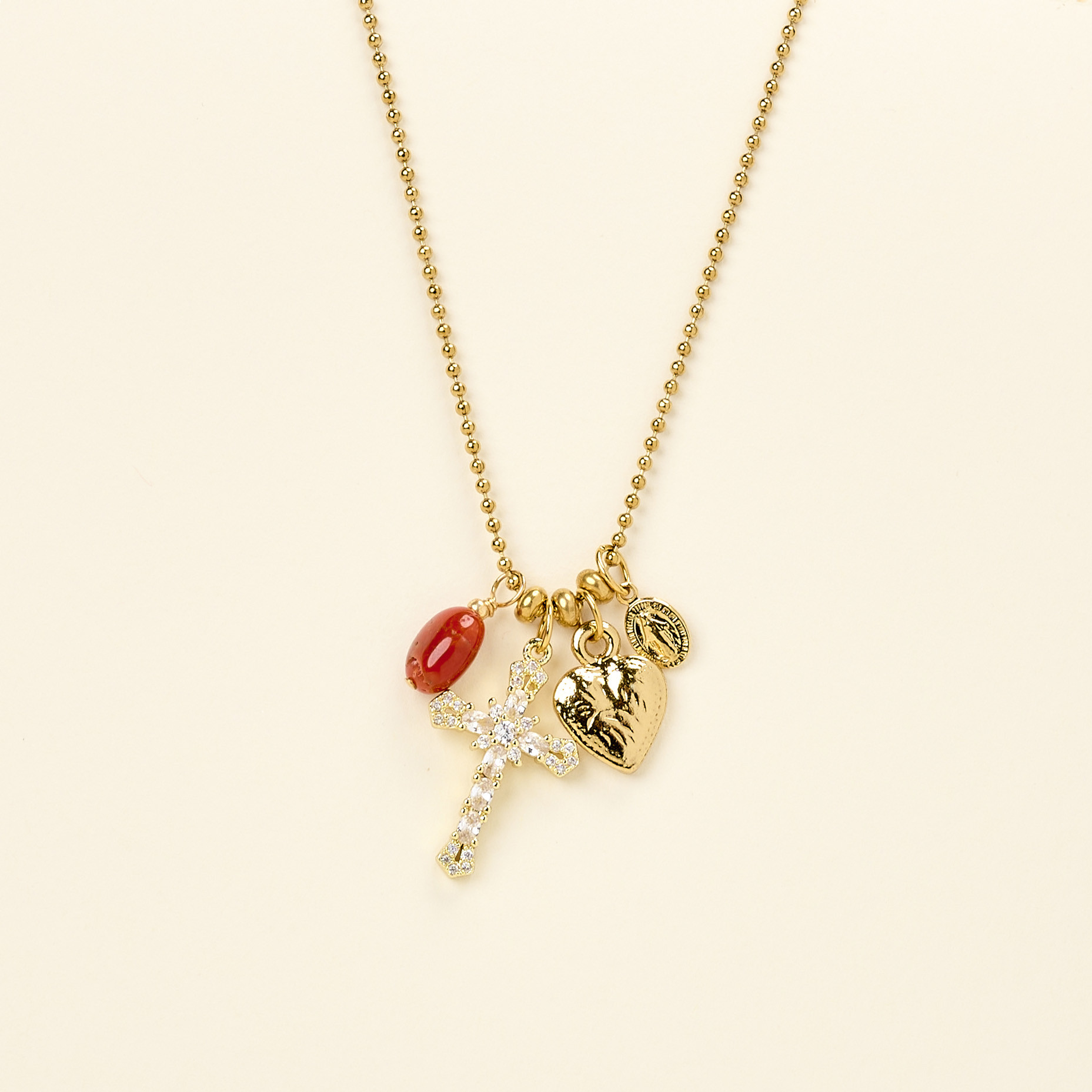 Le collier RUBY CROIX CRISTAL est composé d'une fine chaine boule en acier inoxydable avec plusieurs médailles symboliques: un coeur, une vierge et un pendentif central croix en oxydes et une perle Corail Bambou.