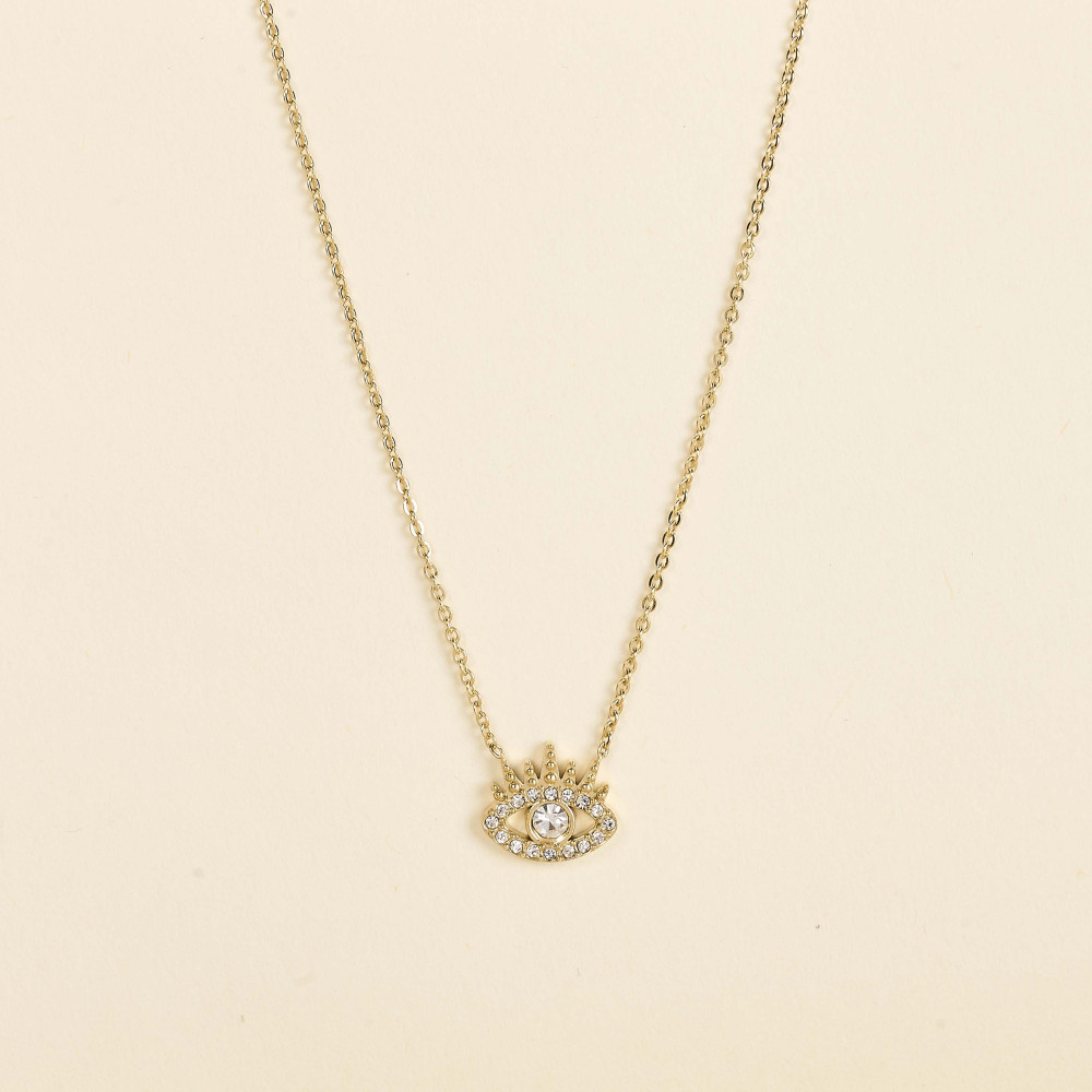 Le collier TOVA OEIL est le bijou précieux sans en faire trop à porter au quotidien. Il est constitué d'une fine chaine dorée de 1mm en acier inoxydable sur laquelle est suspendu un pendentif oeil de 1cm pavée d'oxydes de zirconium.