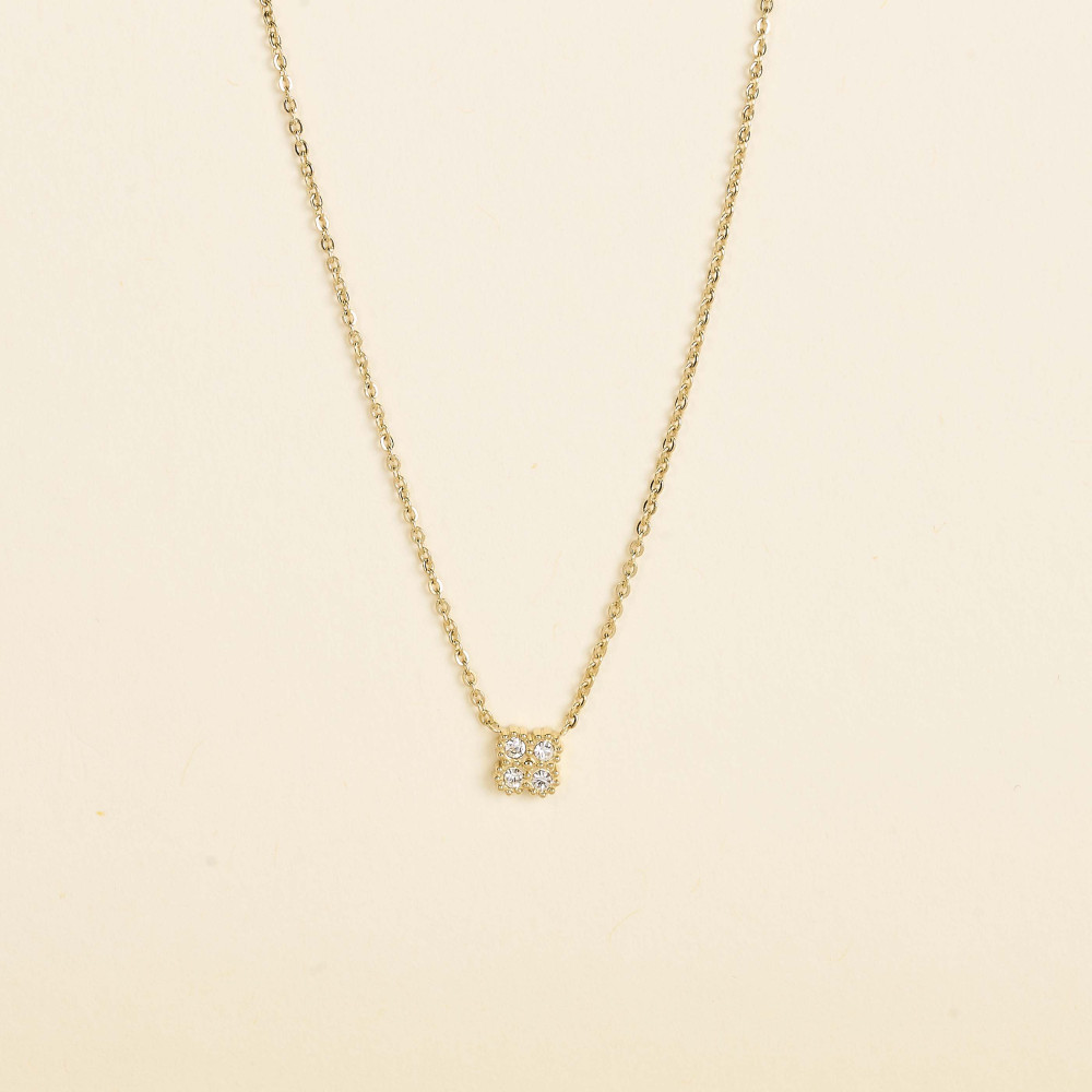 Le collier TOVA CARRÉ est le bijou précieux sans en faire trop à porter au quotidien. Il est constitué d'une fine chaine dorée de 1mm en acier inoxydable sur laquelle est suspendu un pendentif carré de 0,5cm pavée d'oxydes de zirconium.