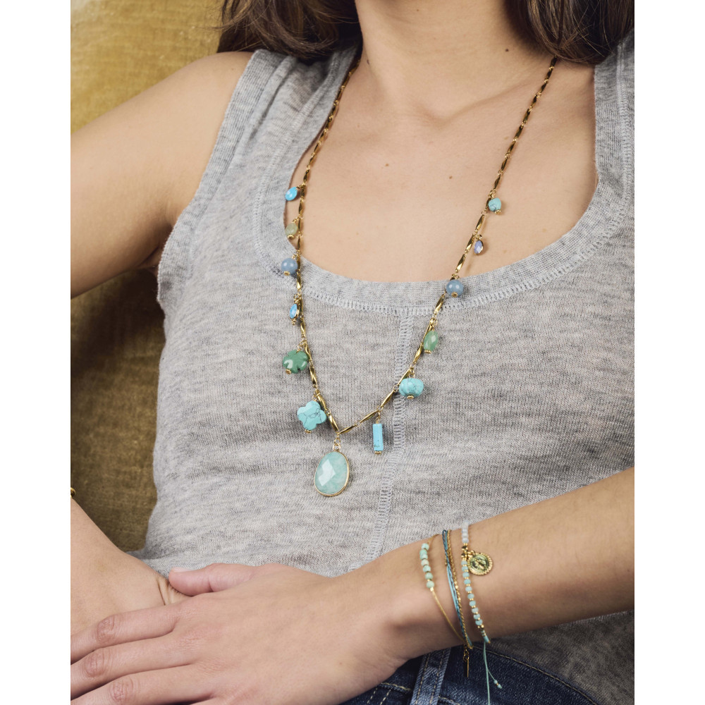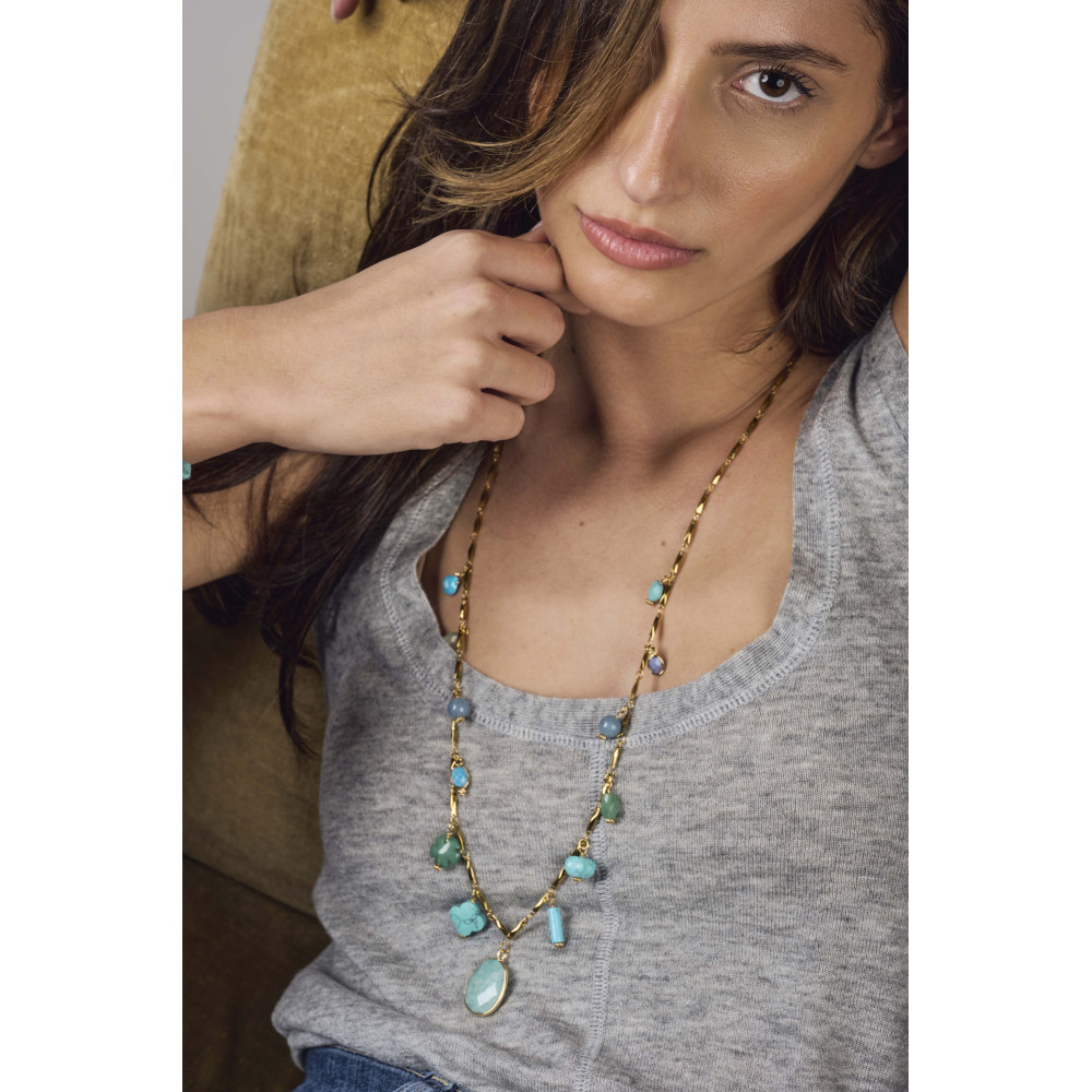 Le collier ALMA TURQUOISE GOUTTE est composé d'une originale chaine en acier inoxydable avec des pampilles en pierres naturelles: Howlite, Quartz bleu et Amazonite.