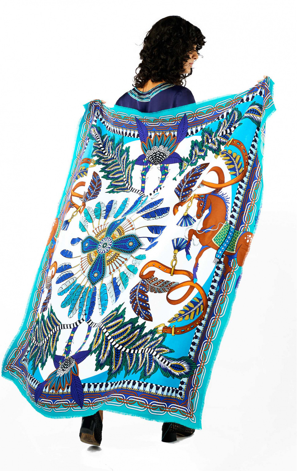 Le foulard PONY PONY BIG de chez Wild vous propose un graphisme riche autour de l'univers équestre, avec un extraordinaire disque solaire au centre.
