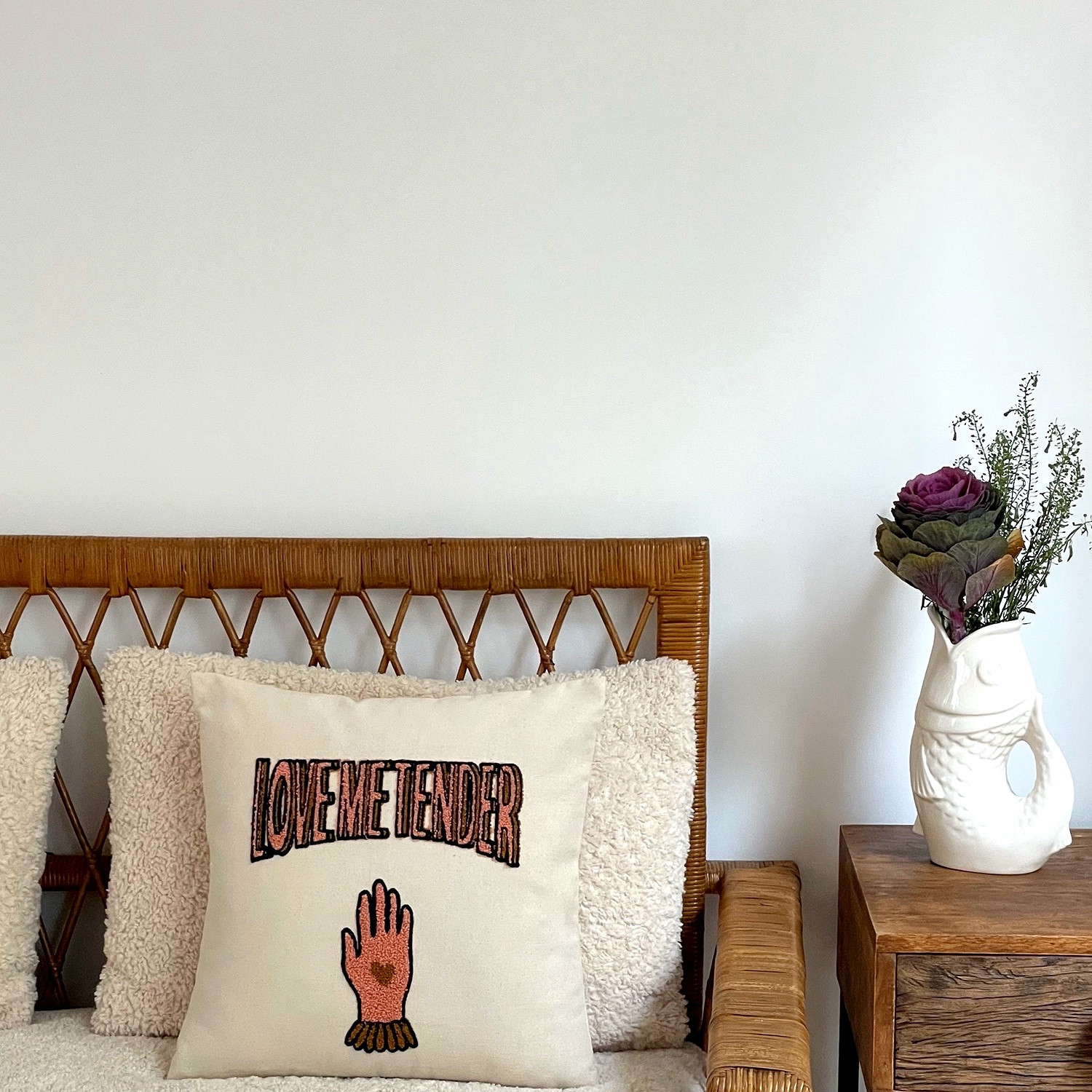 Coussin LOVE ME TENDER en coton blanc avec un dessin en forme de main avec un coeur au centre dans une matière bouclette rose et un message Love Me Tender en bouclette rose en relief.